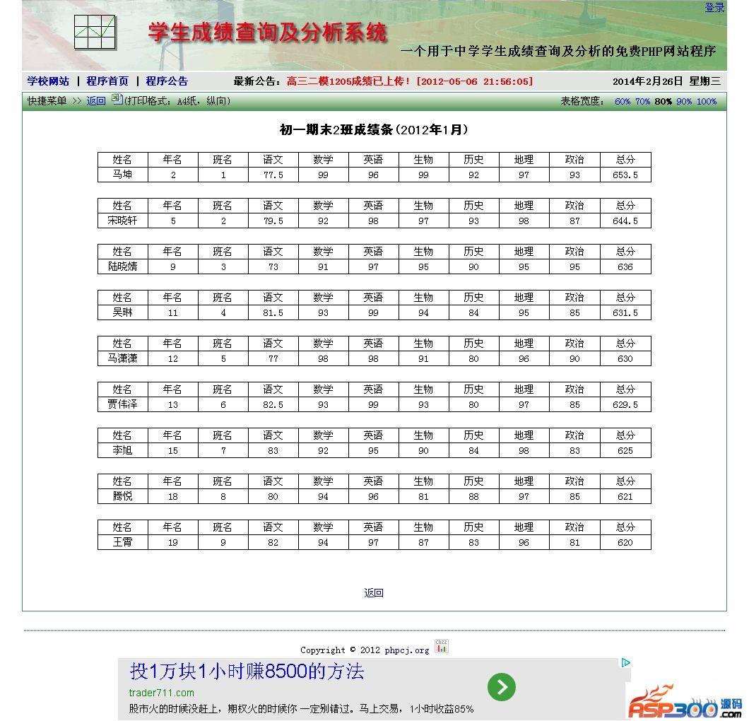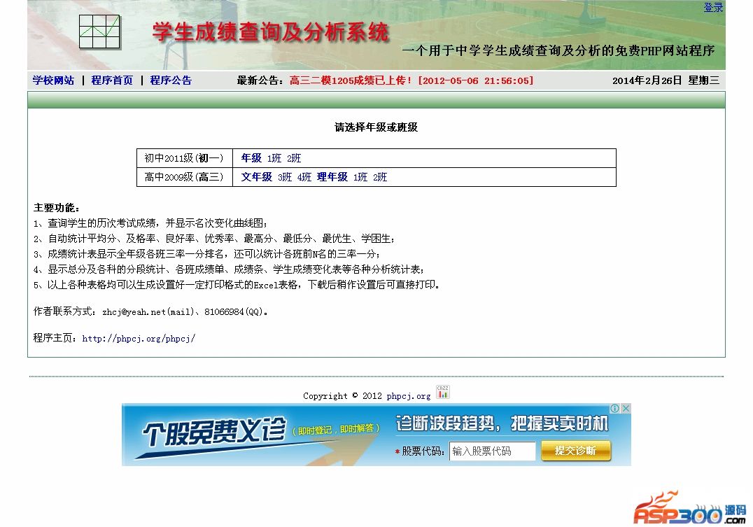 学生成绩查询分析系统是PHP+Mysql制作的用于中学成绩查询、分析的免费网络程序,B/S结构。和传统asp网络程序相比,最大优点是跨平台,Windows XP、Windows 2003、Win7、Gentoo、Centos、Ubuntu、Debian、Fedora、FreeBSD下均测试通过。