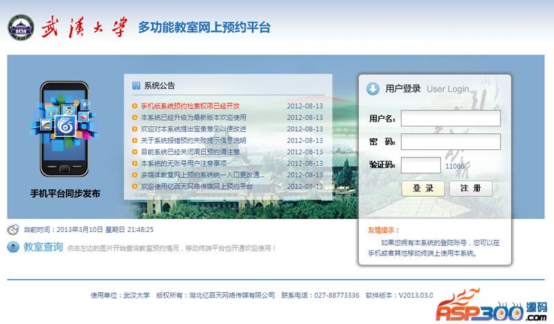 亿百天教室预约平台,是利用先进的 PHP5+MYSQL5 技术开发一套完美的可以供各种学校或者教学培训机构使用的信息化管理软件。系统按照常规的预约管理流程提供了“按照当前日期预约”、“按照周次预约”、“按照空闲教室预约”等多种方式的预约需求。对教室的管理及附加信息设置可以供预约者参考预约。在本系统发布的同时,手机移动版查询功能也同时发布,有助于学生随时随地查询上课信息,极大的方便了学生和老师。目前是国内第一套经过大量数据测试、20万次抗压力测试、众多高校已使用、功能最完善的教室网上预约平台。【测试帐号/密码均为:ebaitian】