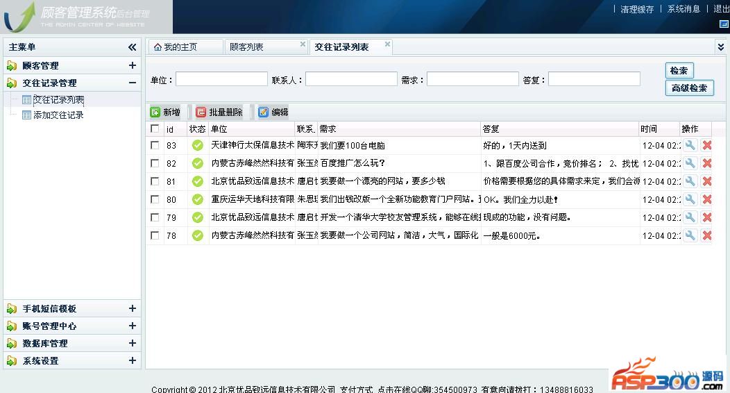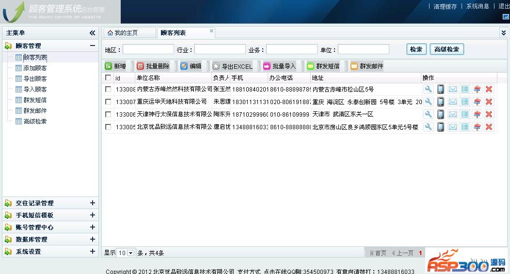 优品致远顾客管理系统v2.0是国内第一流的顾客管理系统,能够多条件精确搜索到顾客群之后,带昵称给顾客群发手机短信,带昵称给顾客群发Email邮件,通过Excel数据文档批量导入会员数据,能够通过后台直接导出全部的会员信息,可以精准匹配顾客之后,导出筛选之后的顾客。可以自行添加、修改、删 除顾客,字段为:单位名称、密码、行业、业务、注册资金、员工人数、负责人姓名、营业执照、手机、QQ、email、办公电话、地址、邮编、网址、公司简介等等,可扩展字段。记录与顾客的交往记录,让您做生意如鱼得水,游刃有余。