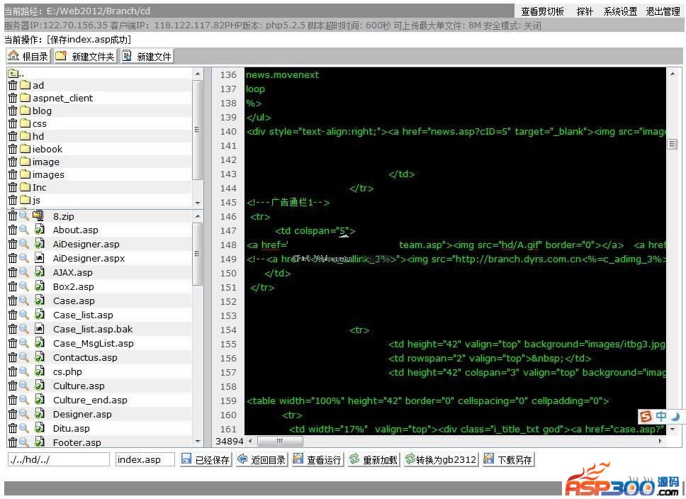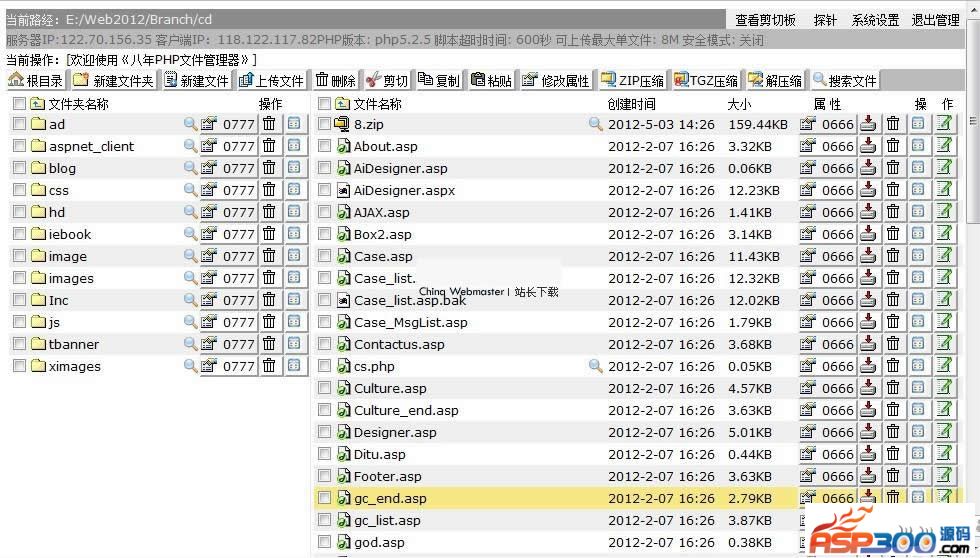 八年PHP文件管理器功能:ajax 无刷新操作支持 批量操作 删除 修改属性 剪切 复杂粘贴 上传支持 无刷新上传支持 js css html php 代码 压缩格式化, 编辑器配色. 代码加亮查看支持在线 ZIP tgz 压缩 解压 , zip 和文件夹 预览支持 文件备注支持 安全 防爆码支持 危险文件扫描 ,ipc 查询, 中英文翻译,批量缩图,邮件快速备份文件到邮箱,简易探针,只有一个文件 方便上传 携带初始密码:000000 上传后请及时修改服务器探针支持 编辑 UTF8(测试工作没有完成 不保证稳定性)其他功能自行发觉吧!默认密码 000000 进入后在设置里 可以修改