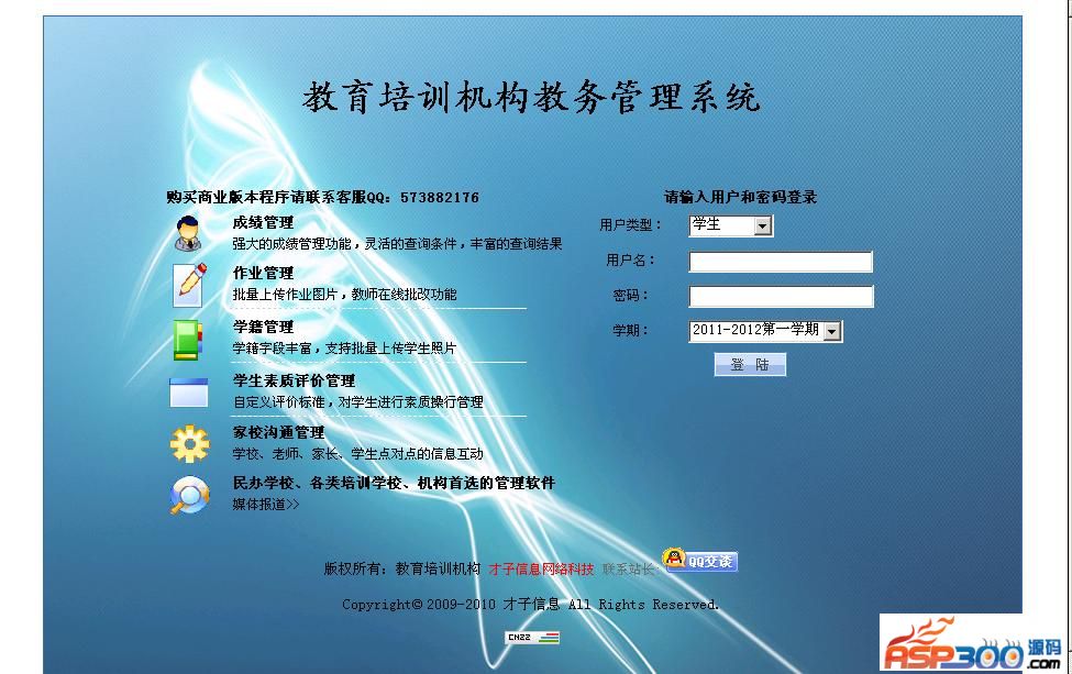 提供8种权限用户:校长室(可查询所有学生成绩信息),班主任(可录入、查询所任班级的所有学生成绩信息),任课老师(可录入、查询所任班级课程的所有学生成绩信息),学生、学生家长(可查询本学生的成绩信息),管理员(最高权限),年级组长(年级中的管理员权限),督察人员(专门针对学生评价系统内容的用户类型)。老师可在网络中录入、修改学生成绩,老师、学生、学生家长登录系统,可查询某一个或多个班的成绩情况,自动排名,自动生成平均分、最高分、最低分;同时可比较多次考试中某个学生的一门或多门程成绩情况(可生成柱状图),学生成绩进步或退步一目了然。支持学生信息、老师信息、任课信息、成绩数据的EXCEL导入功能,支持将所有查询结果输出到EXCEL、WORD、PDF进行保存或输出到打印机,支持生成饼状图、直线图便于查询者进行分段统计查看结果。支持"两率一分"查询,支持按考号进行成绩录入。可查询学生单科及总分的年级名次、班级名次,查询结果为静态显示,大大降低用户查询对系统资源的占用,可支持数百位用户同时进行查询。支持留言,老师可对任班主任和任课的班级或对学校进行留言,学生、学生家长可对所在班级或学校进行留言,增强学校、老师、学生、学生家长之间的互动。支持学校发布最新公告及动态信息,老师、学生、学生家长登录本系统后,在第一页面即可看到此信息,方便学校信息的发布。本软件可广泛适用于大、中、小学校及部队或其它一些需要进行成绩统计、管理的单位,我们亦可根据客户的要求进行相应的模块增减。 教育培训机构教务管理系统v3.0.8版本新增作业管理,适用于美术类培训学校在线上传学生美术作品,老师在线批改、评语。典型客户:上海韧钢美术培训学校
