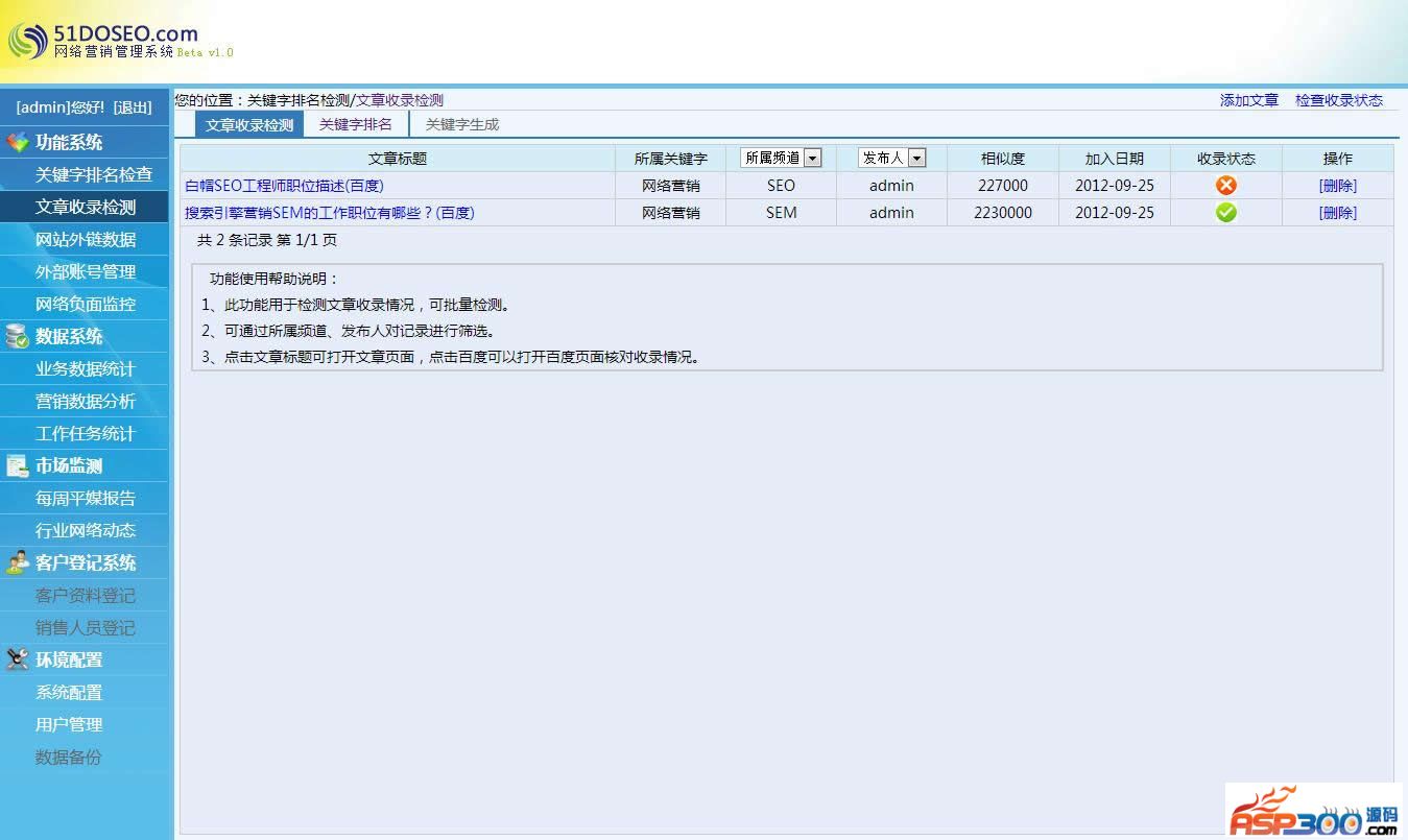 文章收录检测主要是检查自己网站上发布的文章是否被百度收录以及同标题的文章百度收录了多少(相似度)。