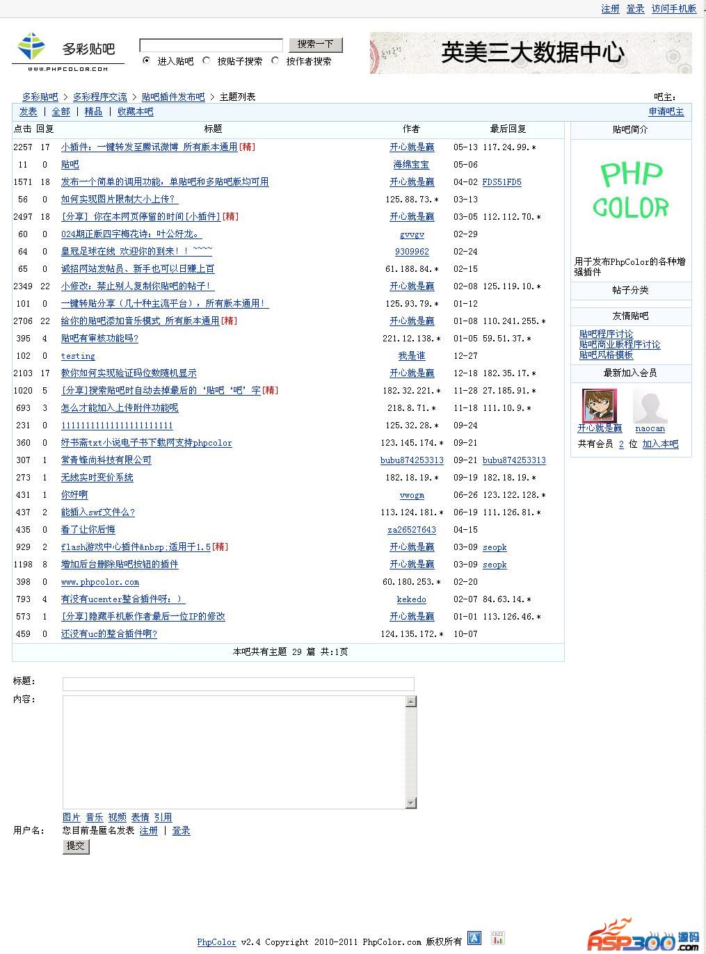 一、基础介绍:PhpColor 采用为php编写,数据库为mysql,使用模板引擎smarty使得程序与页面分离。 基本功能(程序已包含所有贴吧基础功能,在此仅作简单描述,可参考百度贴吧): 支持登录或匿名创建贴吧; 支持登录或匿名发帖回帖; 支持登录用户短消息功能; 支持登录用户申请吧主; 吧主可自定义贴吧图片、简介、申请分类和进行吧务管理; 吧主可申请辞职; 支持多附件上传及插入贴子功能;