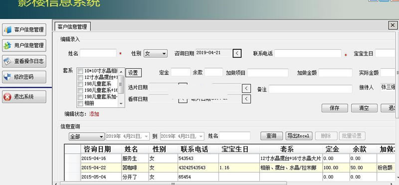 本管理软件可以用于照相馆、婚纱店、儿童摄影等场所。主要可以记录客户信息、预定登记、将客户的要求保存到系统里面,设置预计取片、选片等日期设置。同时也可以用于连锁形式的摄影店铺。中间有些功能有待完善,希望对有这方面需求的朋友有所帮助。 开发环境:VS2005 数据库:SQL2005 内含数据库文件附加上就可以用 ID:66229 声明:本站所有资源均来源于互联网收集,仅供学习参考使用,如若本站内容侵犯了原著者的合法权益,可联系我们进行处理。