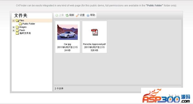 CKFinder是一个易于使用的Ajax文件管理器。提供文件夹树形结构(Folders tree)导航菜单,多语言支持(自动探测用),支持创建/重命名/删除文件和文件夹,集成FCKeditor在线编辑器。软件共包含了42种不同类型的语言,其中就有中文的简体和繁体两种类型