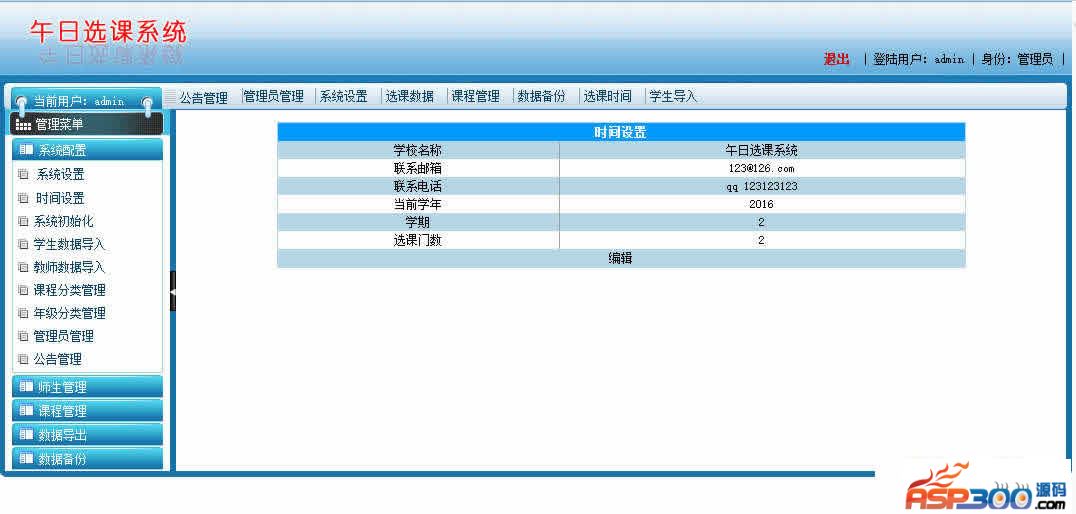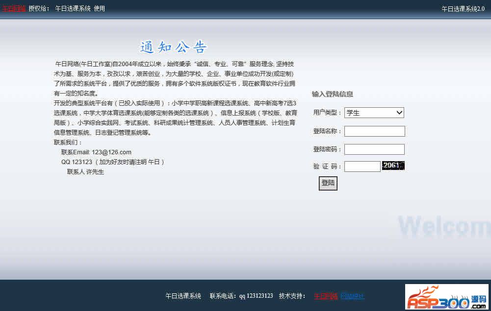 午日选课系统实现学生多门选课,退选,管理员课程添加,学生、老师数据导入,选课数据导出等选课常用的功能。投入实际使用,反响不错的哦。注意事项:1、开发环境为Visual Studio 2010,数据库为ACCESS,使用.net 4.0开发。2、管理员账号密码 admin学生账号密码test老师账号密码test