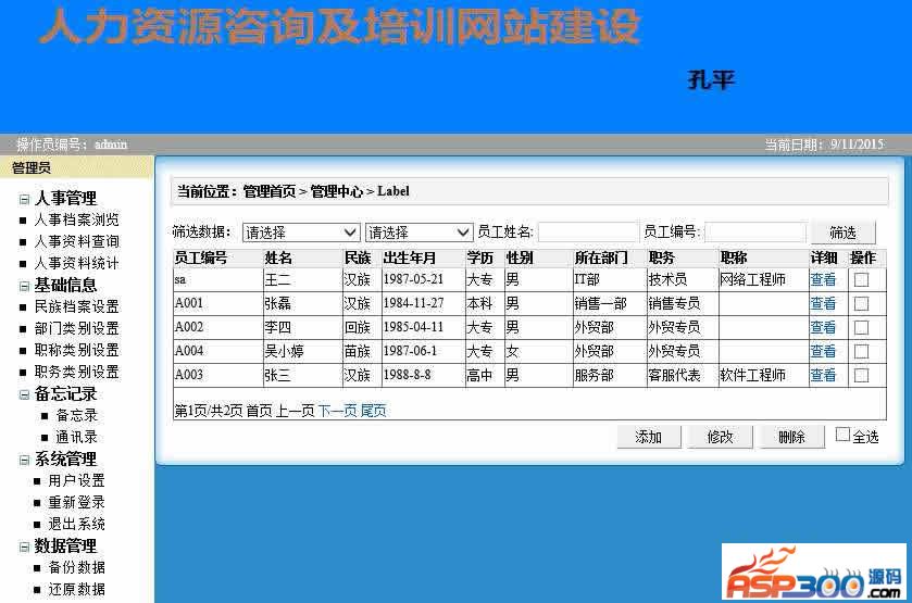 5、人事简历管理:主要实现对人事合同的查询、编辑、删除操作。