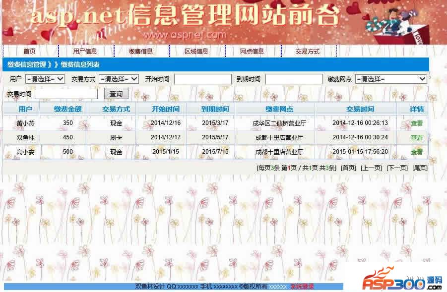 双鱼林宽带缴费信息管理系统基于ASP.NET三层模式开发,比较适合用作毕业设计或者课程设计使用,值得推荐一下,有需要的朋友可以下载看看啊。该源码功能主要包括网站前台和后台两大部分,具体功能介绍如下:1、网站前台:主要包括首页、用户信息、缴费信息、区域信息、网点信息、交易方式。2、网站后台:用户信息管理(添加用户信息、用户信息查询)。缴费信息管理(添加缴费信息、缴费信息查询)。区域信息管理(添加区域信息、区域信息查询)。网点信息管理(添加网点信息、网点信息查询)。交易方式管理(添加交易方式、交易方式查询)。系统信息管理(添加管理员、管理员列表)。注意事项:1、后台管理员用户名密码均是:admin2、开发环境为Visual Studio 2010,数据库为SQL Server 2008,数据库文件在DB文件夹中,使用.net 3.5开发。3、默认数据库连接字符串在webconfig配置文件中修改。