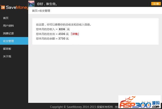 新生帝收支管理系统是有我心爱的人提出的,她每天都有记账的习惯,但都是用本子记的,各种不方便就不列了,所以我便抽工作之余写了这个小小的收支系统。希望有共同需要的朋友们可以使用。本人不才,系统可能存在诸多问题,如有时间可Email我,大家一起共同进步,万分感谢。