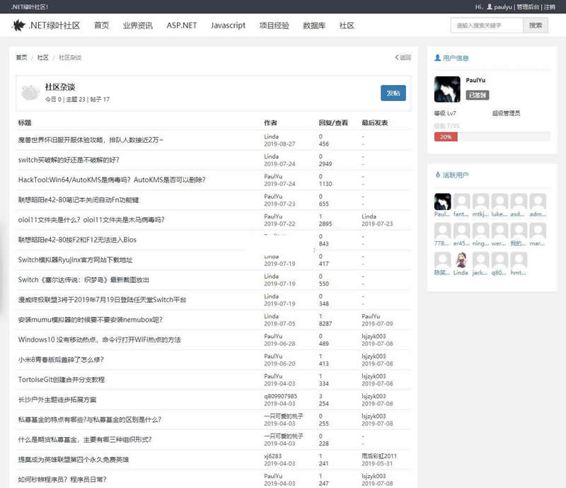 绿叶社区2.1使用C#语言编写,合理使用缓存机制,部分页面生成静态,全站使用bootstrap风格,自适应栅格布局,兼容PC及移动端自适应展示,注重SEO优化,风格简约,安装方便,适合个人发布内容。程序包含了博客系统的最基本功能,包括一些营销功能,如轮播图,广告代码等模块。