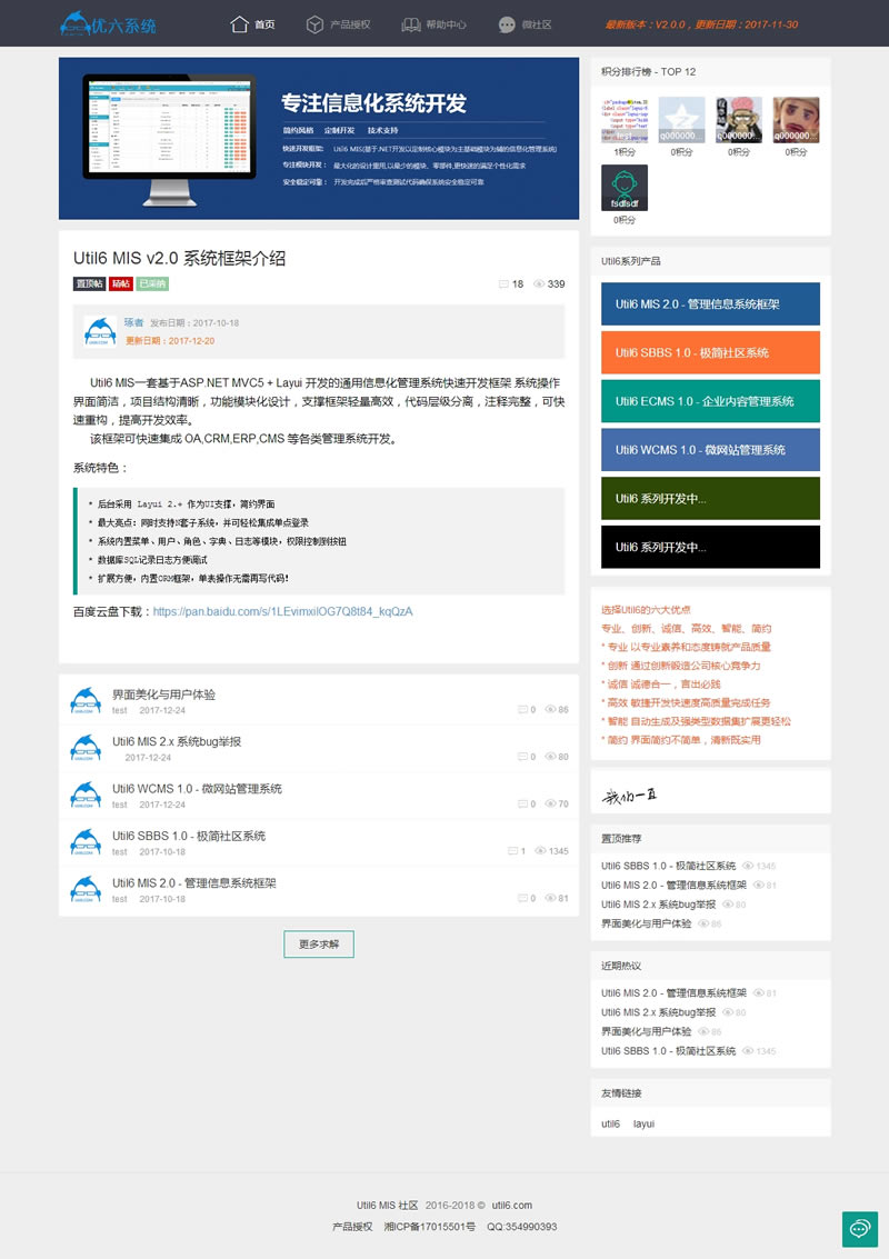 Util6 CMS、DMS、OAS、WXS是在信息化管理系统框架(Util6 MIS)基础上开发的插件系统,Util6 MIS一套基于ASP.NET MVC5 + Layui 开发的通用信息化管理系统快速开发框架 系统操作界面简洁,项目结构清晰,功能模块化设计,支撑框架轻量高效,代码层级分离,注释完整,可快速重构,提高开发效率,该框架可快速集成各类管理系统开发。