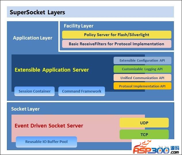 SuperSocket是一个轻量级的可扩展的Socket开发框架,可用来构建一个服务器端Socket程序,而无需了解如何使用Socket,如何维护Socket连接,Socket是如何工作的。该项目使用纯C#开发,易于扩展和集成到已有的项目。只要你的已有系统是使用.NET开发的,你都能够使用SuperSocket来轻易的开发出你需要的Socket应用程序来集成到你的现有系统之中。SuperSocket具有如下特点: