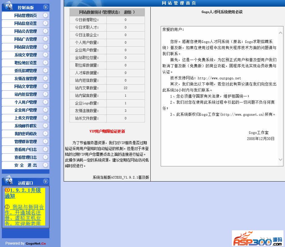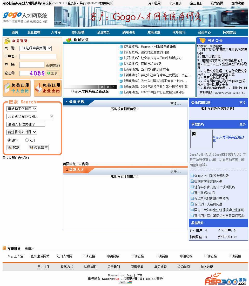 GOGO人才网系统ASP版以强大的用户互动功能打造优秀人才与招聘网站系统,支持会员管理、文章管理、广告管理、留言板全功能。