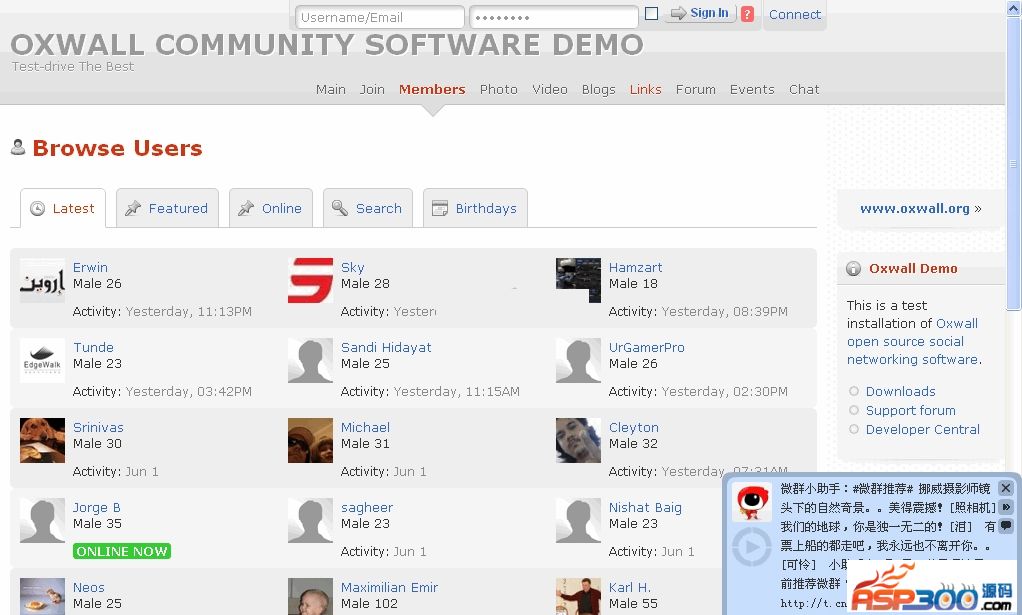 Oxwall是一个采用PHP+MySQL开发,功能齐全的SNS社交网络系统。它能够让用户创建群组,活动,博客,论坛和上传照片与视频,可以对任意内容发表评论和添加标签。Oxwall支持通过插件扩展现有功能,外观也可以通过模板自定义。Oxwall提供了一个强大的后台管理系统来控制用户和任意内容,查看统计,管理广告和其它详细配置。支持多语言。Oxwall v1.3.0 changelog:New FeaturesPrivate Groups (as suggested by users)This new plugin allows users to create Private Groups, invisible to others. New members can be invited either by admins or by other group members.Private ForumAdmins and Moderators can now create Private Forums for specific User Roles.Block Users (as suggested by users)Users can now block each other. Once blocked, a user will no longer be able to send IM/PM, become friends, follow and add comments to content of the block initiator. Blocking a user will immediately sever all Friendship and Follow links.Major ImprovementsInvite FriendsWe\’ve completely revamped Invite Friends feature, which is now compatible with new Facebook and Google APIs.Mass MailingUser roles can now be selected for mass mailing.WYSISYG EditorWYSISYG editor was replaced by simple text area for mobile devices.Enhancements and BugfixesUnsibscribeWe\’ve added an additional step to confirm unsubscription.Maintenance PageMaintenance Page login link was added for easier Admin access in case the page needs disabling.Verification MailThe system no longer sends two emails at once – instead it sends a Verification Letter first, and then a Welcome Letter after the verification.Google Chrome AttachmentsIssue with incorrectly displaying full-size attached pictures in Google Chrome fixed.Events ImprovedEvents End Date completely reworked to appear after check-box is ticked.Mass Mailing VariablesVariables can be added to the Subject now.User Profile and Dashboard PagesMinor improvements for these pages management through the Admin Area.Privacy ImprovementsPrivate album bug fixed.