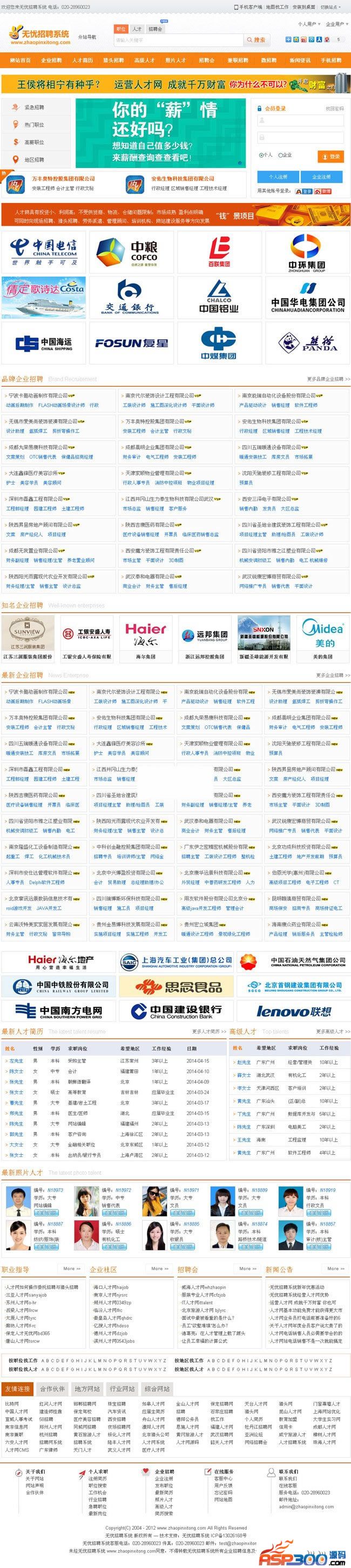 无忧招聘系统要功能:企业招聘、 个人求职、 猎头招聘、 招聘会、 兼职招聘、 微招聘、 人才测评、 新闻资讯、 手机招聘、后台管理等几大版块。