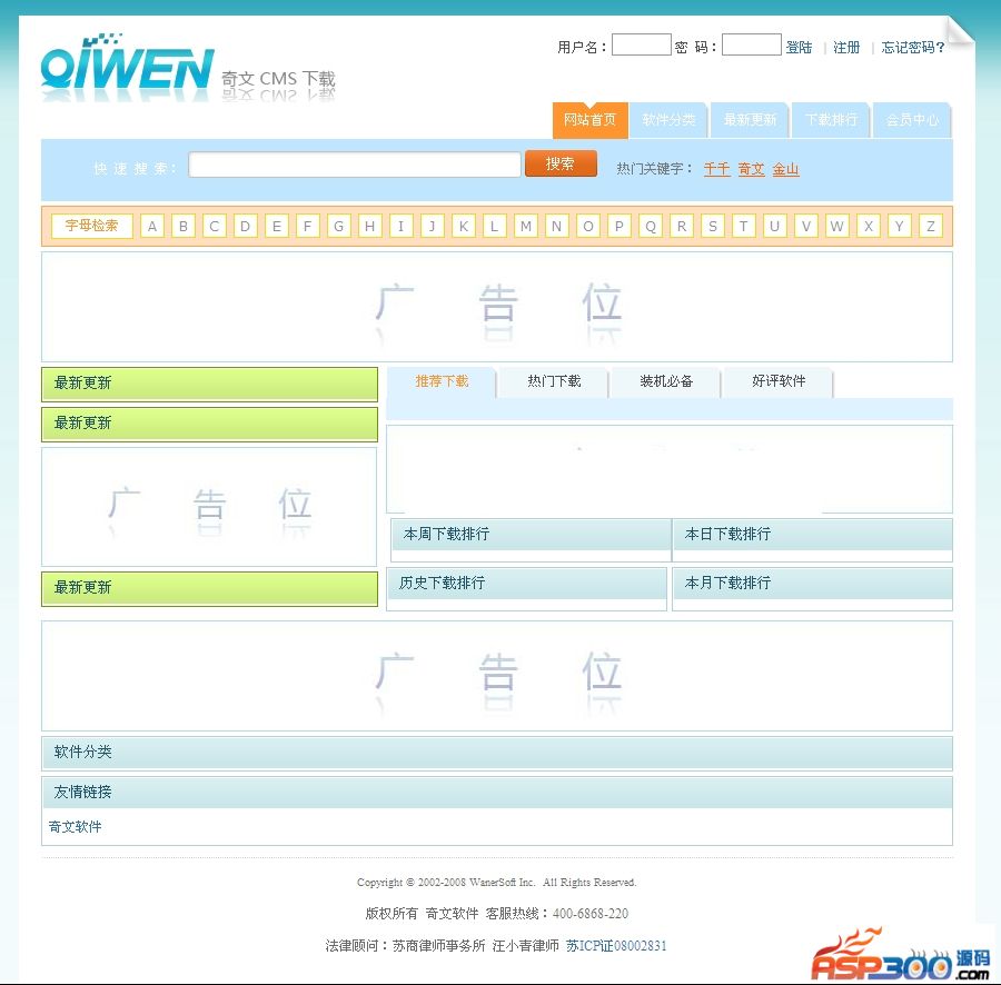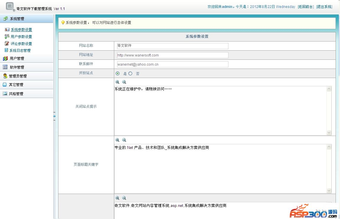 性能强劲的网站内容管理平台,结合ASP.Net 2.0、XML及SQL Server 2005为打造综合应用门户而量身定做!我们一直致力于为站长提供高性能、扩展性强、功能全面、稳定可靠的解决方案及产品。奇文网站内容管理系统(WSCMS)是奇文软件在2010年迈出的一个跨越性的步伐,本次发布的网站内容管理系统中的软件下载管理部分仅仅是一个前奏。奇文软件下载管理系统特色:先进的定制模块功能,可选择数据库字段并设置样式,配置出想要的风格样式。