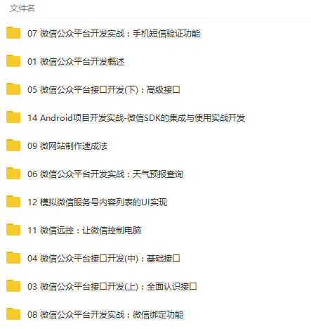 微信公众平台开发从入门到精通课程视频教程下载,本体系从初学者角度出发,从简单到深入,通过通俗易懂的语言,丰富多彩的实例及非常清晰化的流程详细介绍了微信公众平台进行项目开发所需要掌握的知识;并在体系后期进行真实项目实例开发,让学员充分掌握前期学习的开发知识,认真学习完本套课程,你会成为一个优秀的微信公众平台开发者。