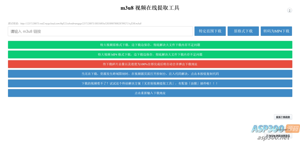 该源码支持将m3u8视频源转换为MP4格式进行下载或者原m3u8格式下载!!待下载碎片总量以及进度为100%全部完成后将自动合并弹出下载。无需安装,打开网页即可用,强制下载现有片段,无需等待完整视频下载完成。