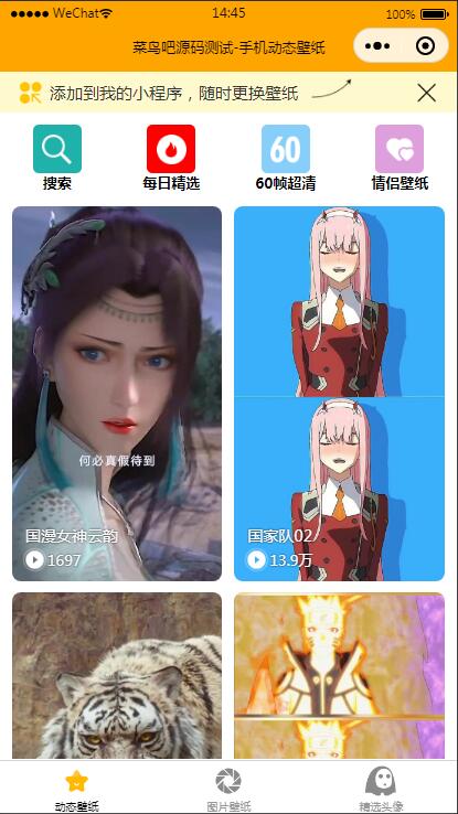 【已测】微信小程序手机动态壁纸头像小程序(带流量主)源码 不需要域名服务器,直接添加合法域名,上传发布就能使用。下边是我在开发工具 实测的图片,正常显示,下载功能正常,提示的advertisement错误是微信流量主广告错误, 不影响使用,开通流量主后有能力的可以自己添加。 ID:73738 声明:本站所有资源均来源于互联网收集,仅供学习参考使用,如若本站内容侵犯了原著者的合法权益,可联系我们进行处理。