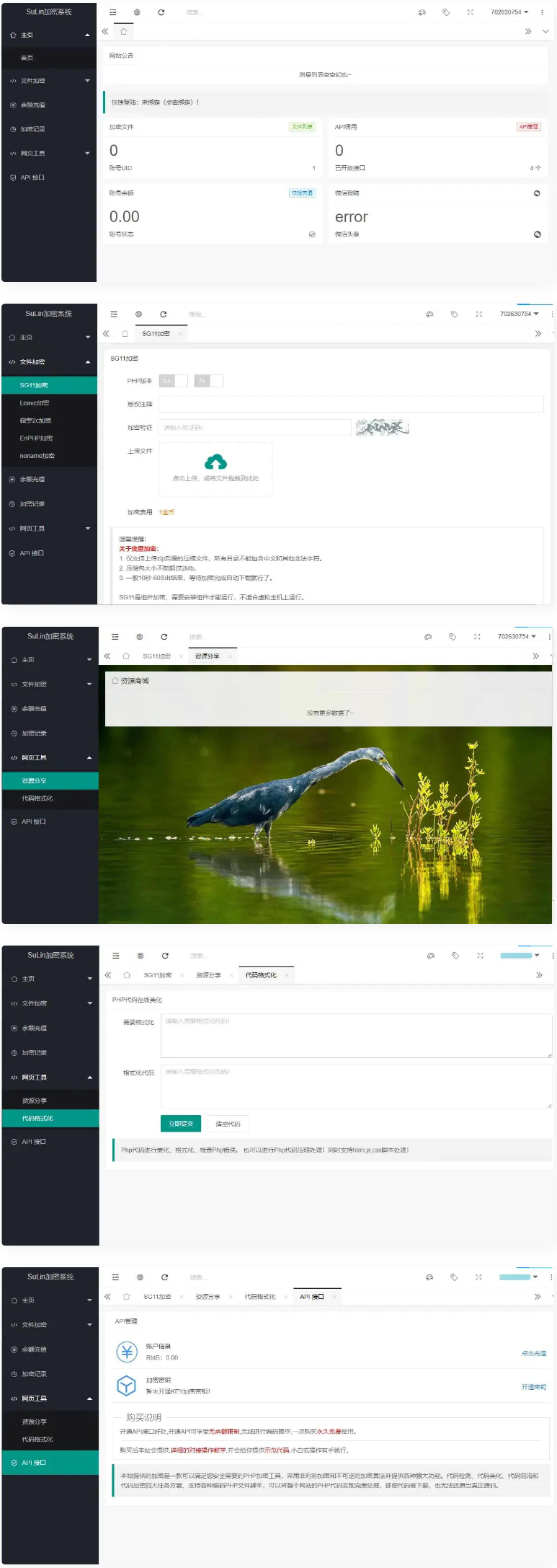 可以发展用户,可以设置某加密价格,支持API接口加密,对接官方支付、码支付和易支付。