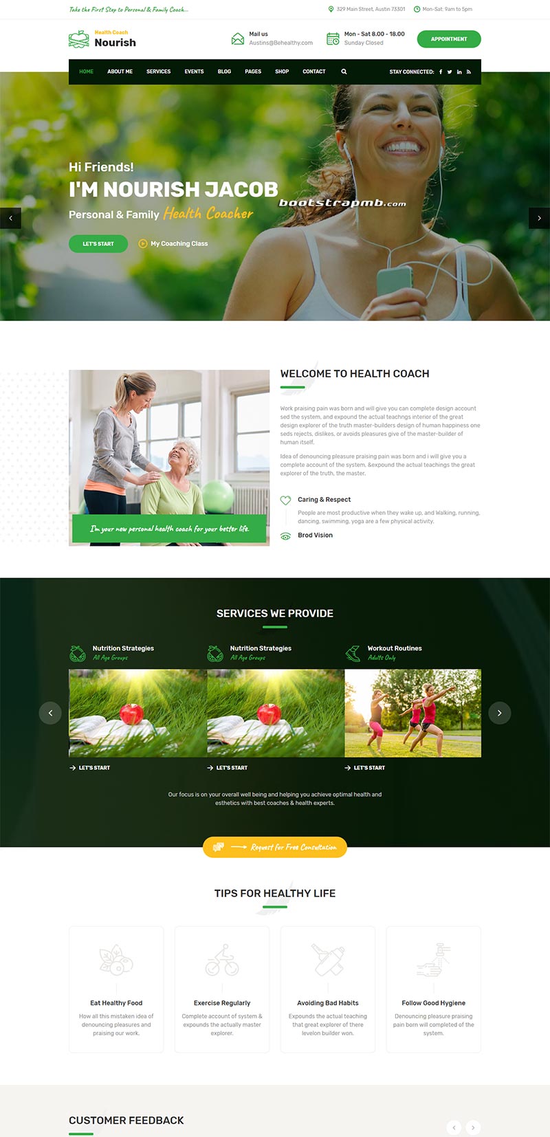 绿色宽屏的个人生活健康锻炼服务网站HTML5模板,可用于比如健康指导、私人护理等等。这个HTML5模板基于Bootstrap框架构造,编辑起来很容易。 ID:76421 声明:本站所有资源均来源于互联网收集,仅供学习参考使用,如若本站内容侵犯了原著者的合法权益,可联系我们进行处理。