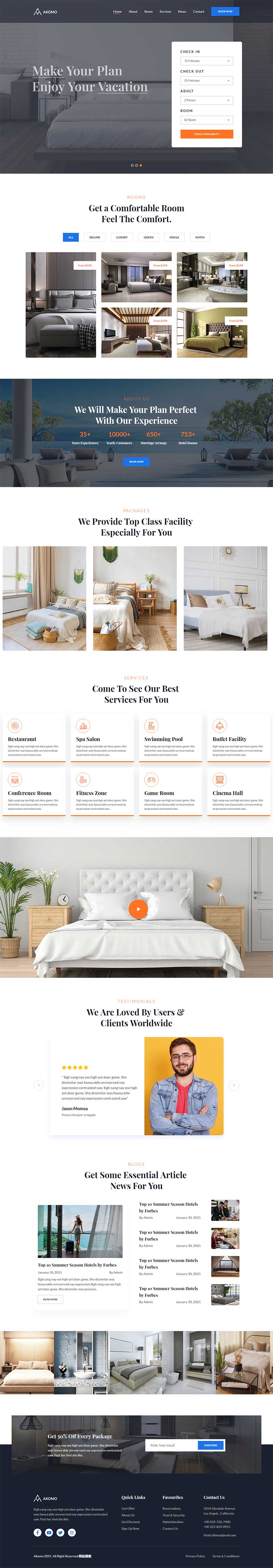 一款多功能的酒店预订,度假村住宿,酒店服务网站模板。特别是为住宿,床和早餐,重新排序,所有类型的酒店业务和那些提供住宿相关服务。具有美观和独特的设计,最适合您的在线网站。它具有100%的响应式设计,并在所有主要手持设备上进行了测试。包含:房间图片展示和房间细节、关于我们、服务和博客页面等。
