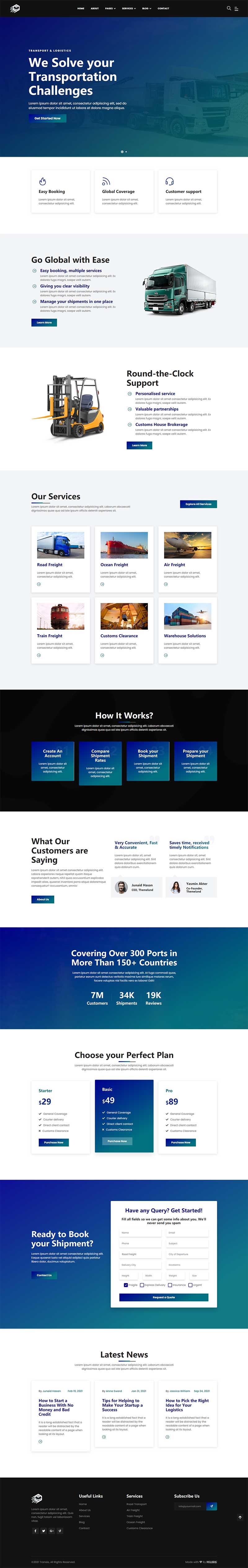 一款黑色大气的货物运输,物流快递行业和搬家公司网站HTML模板。它是完全响应式布局,易于定制修改。基于网格模式的最终页面布局、不同的博客布局、页面转换和独特的排版。它也很容易使用。适用于从智能手机、平板电脑到台式机的所有设备。