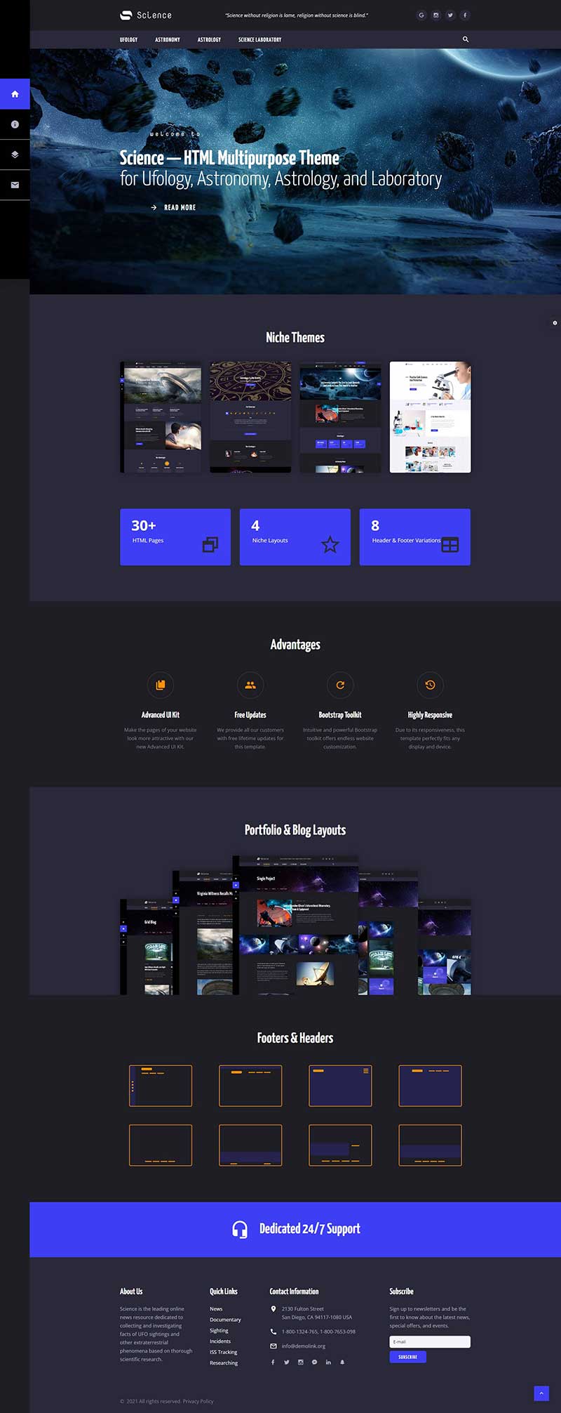 这是一款超级炫酷带动态背景的深色模式HTML多用途主题网站模板,可用于很多场景的网站建设如Ufology、天文学、占星术和科学实验室等,设计效果很赞,欢迎大家下载。
