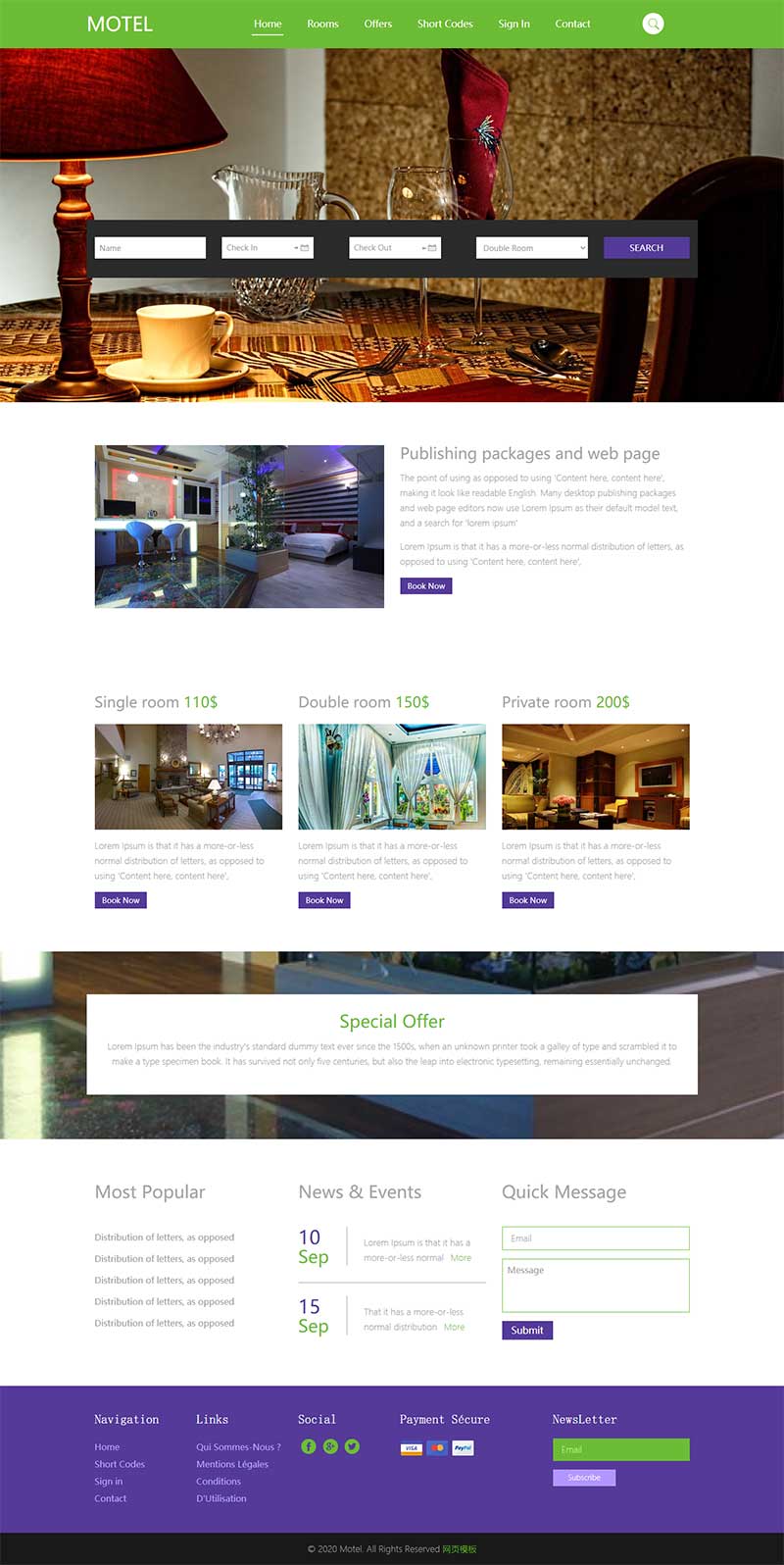 这款经典实用的酒店展示及预订网站模板,在首页就包含了酒店预订日期、房型、入住和离开选择,符合现在人的方便快捷,是酒店网站必备功能。觉得不错的小伙伴直接下载使用,模板可自由编辑。 ID:75813 声明:本站所有资源均来源于互联网收集,仅供学习参考使用,如若本站内容侵犯了原著者的合法权益,可联系我们进行处理。