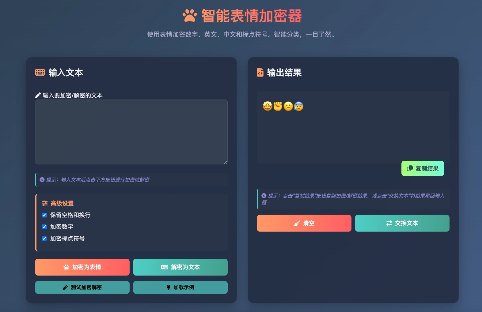 这是一款表情密文翻译器单页源码,作者在浏览博客时获得灵感,并以此为契机锻炼代码能力开发而成。核心功能是将中文、英文、数字及标点符号转换为特定的表情符号组合,同时支持反向解析,具备智能字符类型分类能力。