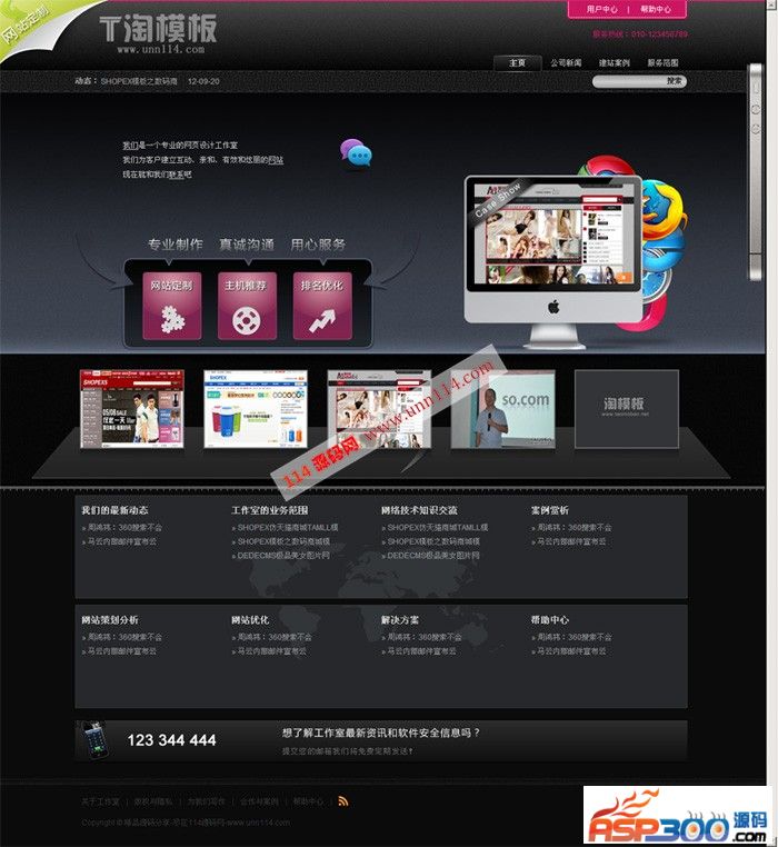 整站风格黑色,外观很大气,功能主要就是网络建站和模版开发,栏目不多,但是很实用,适合做工作室或者公司网站。