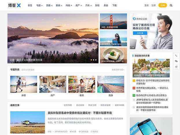 主题首页内容可展示幻灯片置顶文章、专题列表等精妙设计的内容模块,对网站用户具有极大吸引力。