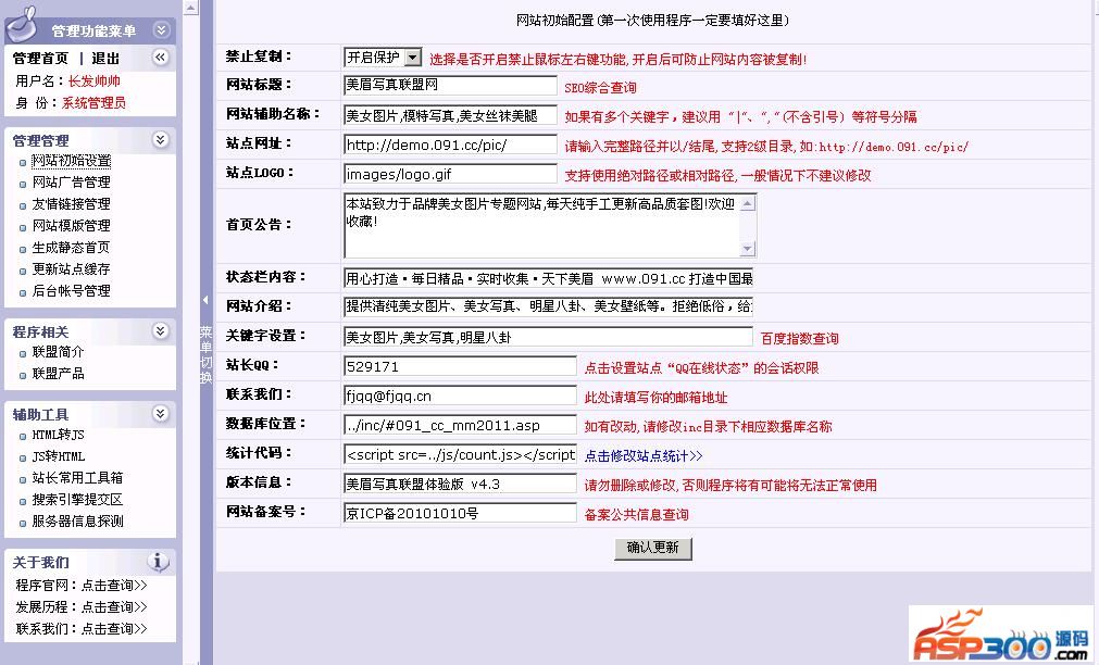美眉写真内容联盟伪静态后台体验版 V4.3 (更新发布:2012.01.03) 更新日志