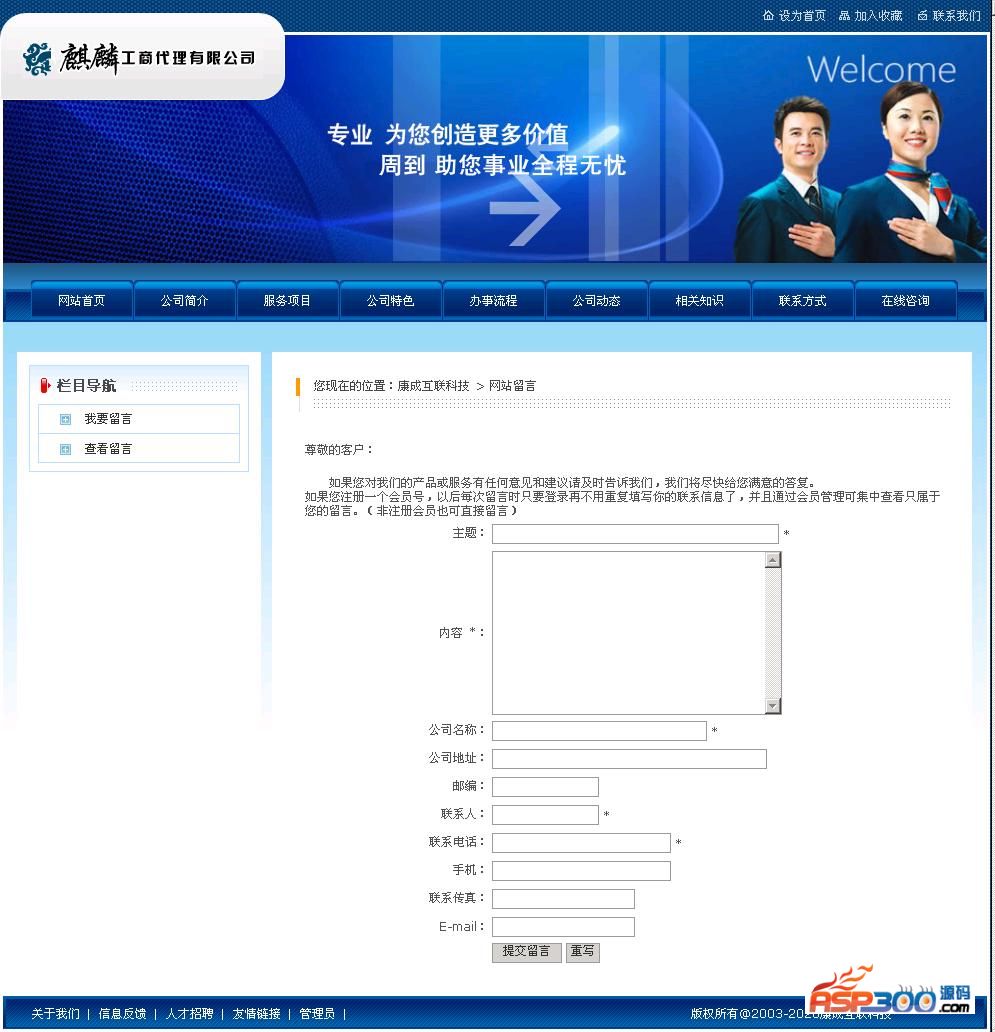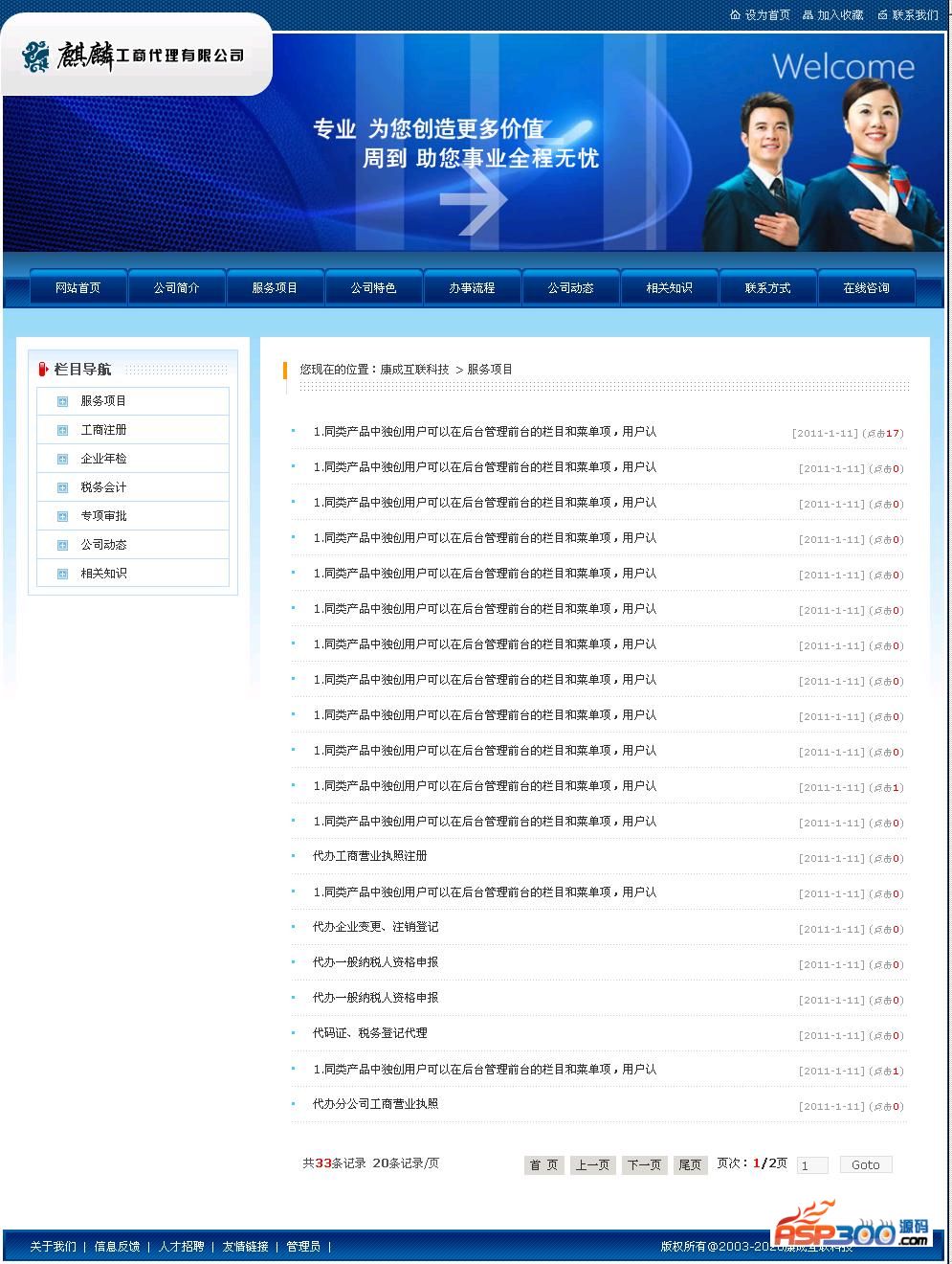 康城公司注册类网站系统整合了公司注册类网站的常规的栏目,包含了服务项目、公司特色、相关知识、办事流程图、企业荣誉、新闻、公司简介、联系我们。后台的功能就不一一介绍了,用了就知道了,方便,简单,会打字就会用这套系统。