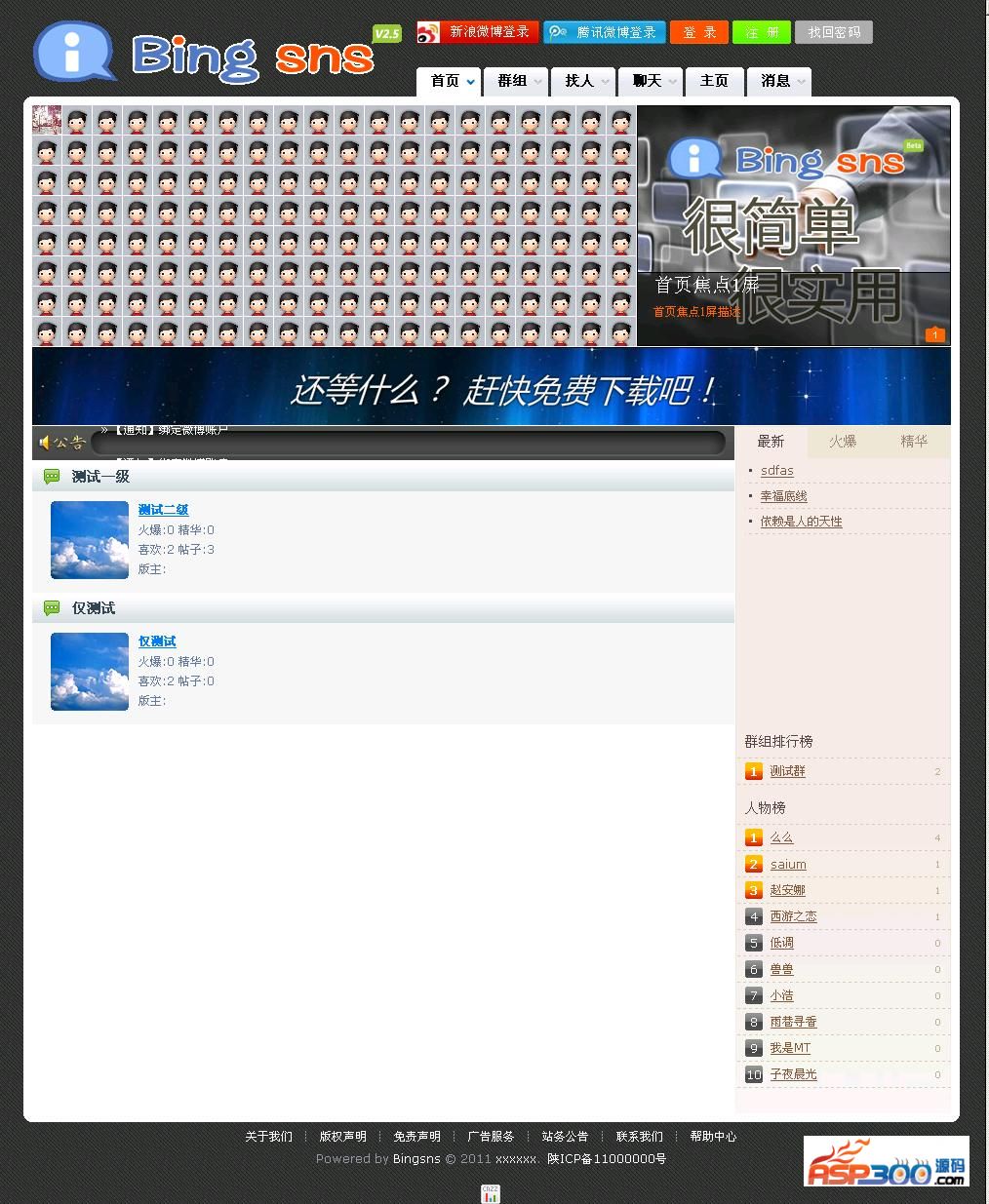 Bing SNS是一个以社交网络为基础的专业应用平台,主要针对垂直领域的服务和运营。把门户(Portal)、论坛(BBS)、社交(SNS)、微博(Micro Blog)的特性融合一体,从而提高了信息的交互和传播等特性,强化了开放平台的特点,使应用和推广充分融合于一体,真正的做到了细致化的一站式服务。主要功能包括:论坛、发帖、版主、关注、粉丝、找人、群组、聊天、群聊、消息、相册、检索、3级标签(包含权限设置)、广告服务、短信服务、邮件服务、网银在线、客户端软件、微博接入等一系列综合应用服务。