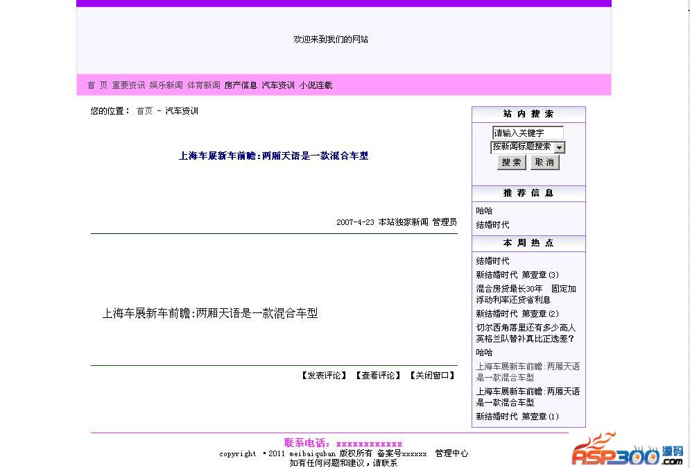 ASP简易新闻发布系统完全开放,属于开源程序,适合二次开发,程序默认模板极为简洁,支持模板修改功能,用户可以根据自己的方式,自己制作模板。