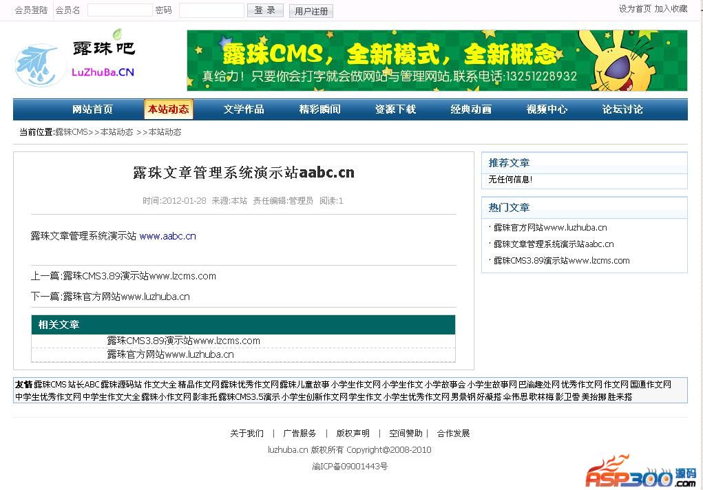 露珠CMS是一个以文章类、下载类、图片类、动画类、视频类为主的综合网站。我们的目标:麻雀虽小,五脏俱全!致力于打造互联网上程序最小功能齐全的网站源码,只要你会打字就会做网站和管理网站。