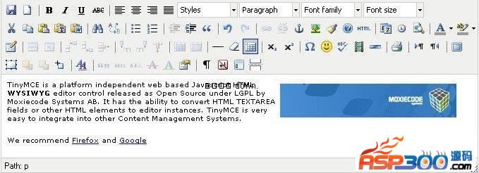 TinyMCE是一个轻量级的基于浏览器的所见即所得编辑器,支持目前流行的各种浏览器,采用JavaScript/ECMAScript开发,主要特性包括主题/模板支持,多语言支持(包括简体中文),支持通过插件的方式进行扩展。功能配置灵活简单(两行代码就可以将编辑器嵌入网页中),支持AJAX。另一特点是加载速度非常快,如果你的服务器采用的脚本语言是 PHP,那还可以进一步优化。最重要的是,TinyMCE是一个根据LGPL license发布的自由软件,你可以把它用于商业应用。