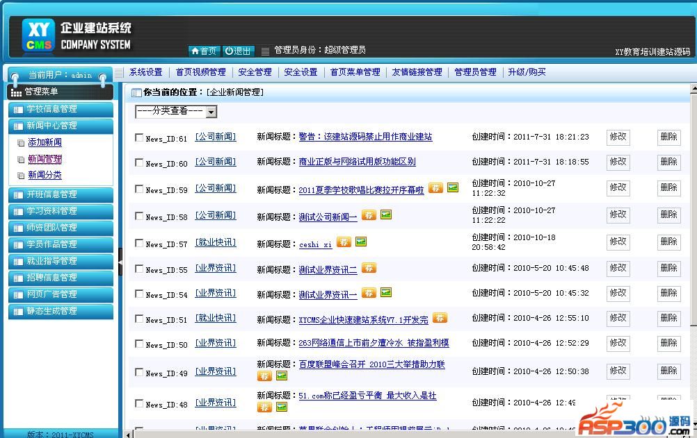 新闻中心管理:管理新闻信息内容,管理相关分类,添加或者删除
