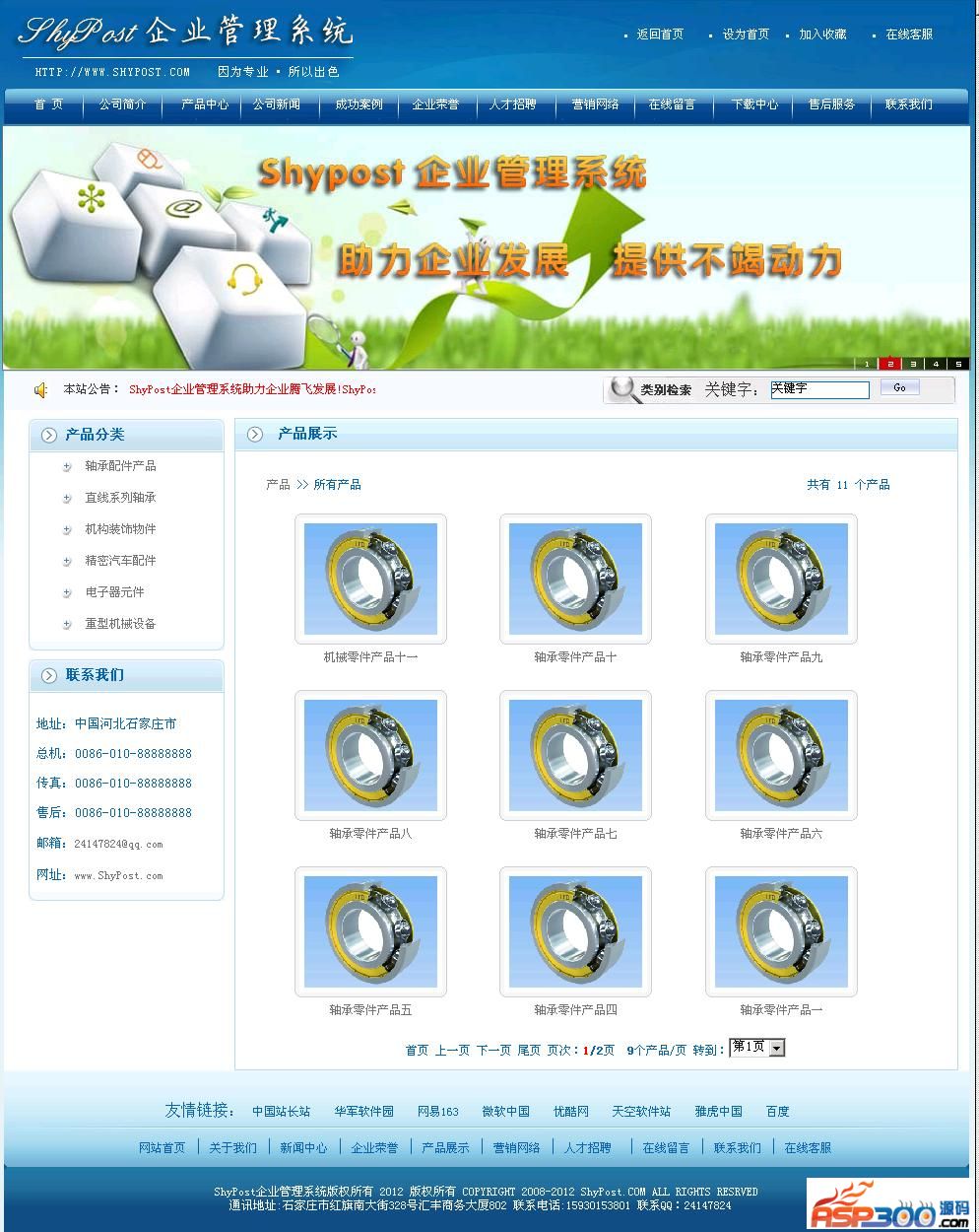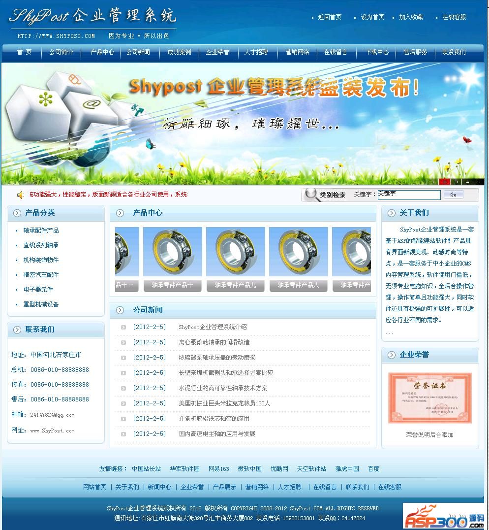 ShyPost企业管理系统拥有十几种模板,可供用户自由选择,适合各行各业使用,各模板均精心开发、界面美观时尚、动感十足!如流行的蓝色基调彰显科技以人为本的宗旨,时刻给人以无限的美感!软件具有强大的前台展示和后台管理两部分组成。支持长幅动态广告图片调用。商品滚动展示功能。导航栏目内容划分清晰明了,包括公司简介、产品中心、公司新闻、成功安全、人才招聘、在线留言、下载中心等十几个栏目内容,完全可以满足各类企业的需求。