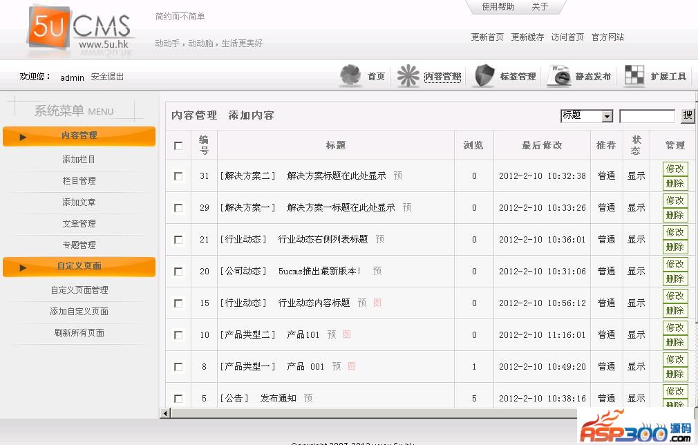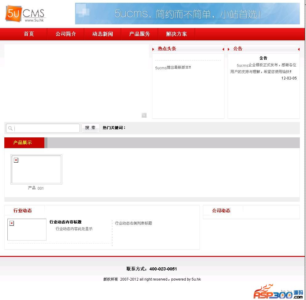 5u网站管理系统,是一款国内最专业、使用人数最多、应用范围最广的小型 ASP网站建站系统,适用于中小型企业自主建站,它使用方便快捷 、操作简单 明了、安装部署灵活,并提供海量插件,及各各行业的模板免费下载,seo友 好性强,简约而不简单,可应用于图片站、企业站、文章资迅站、 下载站等等,是企业建站的最好选择。5uCMS v3.2012.0503更新说明:新增栏目大类分页标签属性