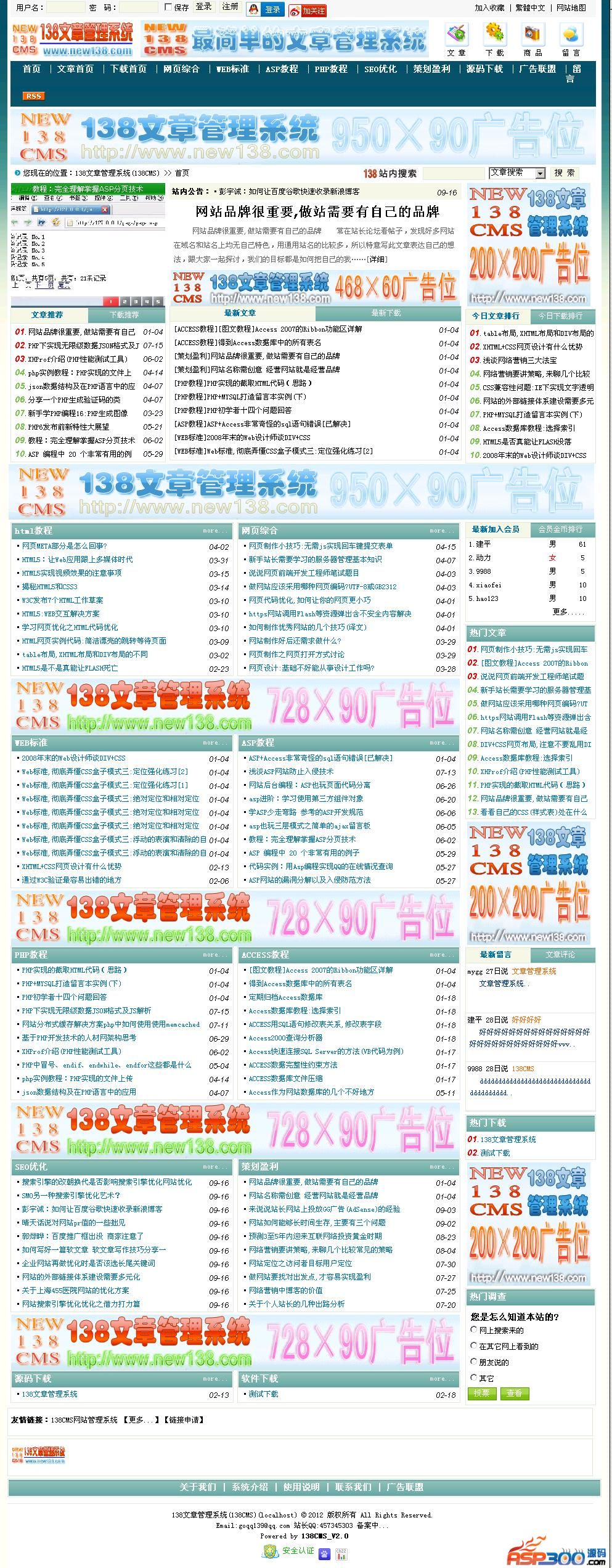 138CMS网站管理系统采用Asp+Access开发,适应中小新闻文章类型或下载类型或图片类型网站及个人网站需求,整个网站采用Div+Css布局,IE6、IE7、IE8、Chrome、QQ、傲游、Opera、搜狗、百度、360、猎豹浏览器、等浏览器下测试无误,且兼容性良好!