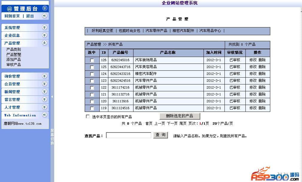 4、产品展示(支持3级目录,添加会员购物车功能,产品回复留言)