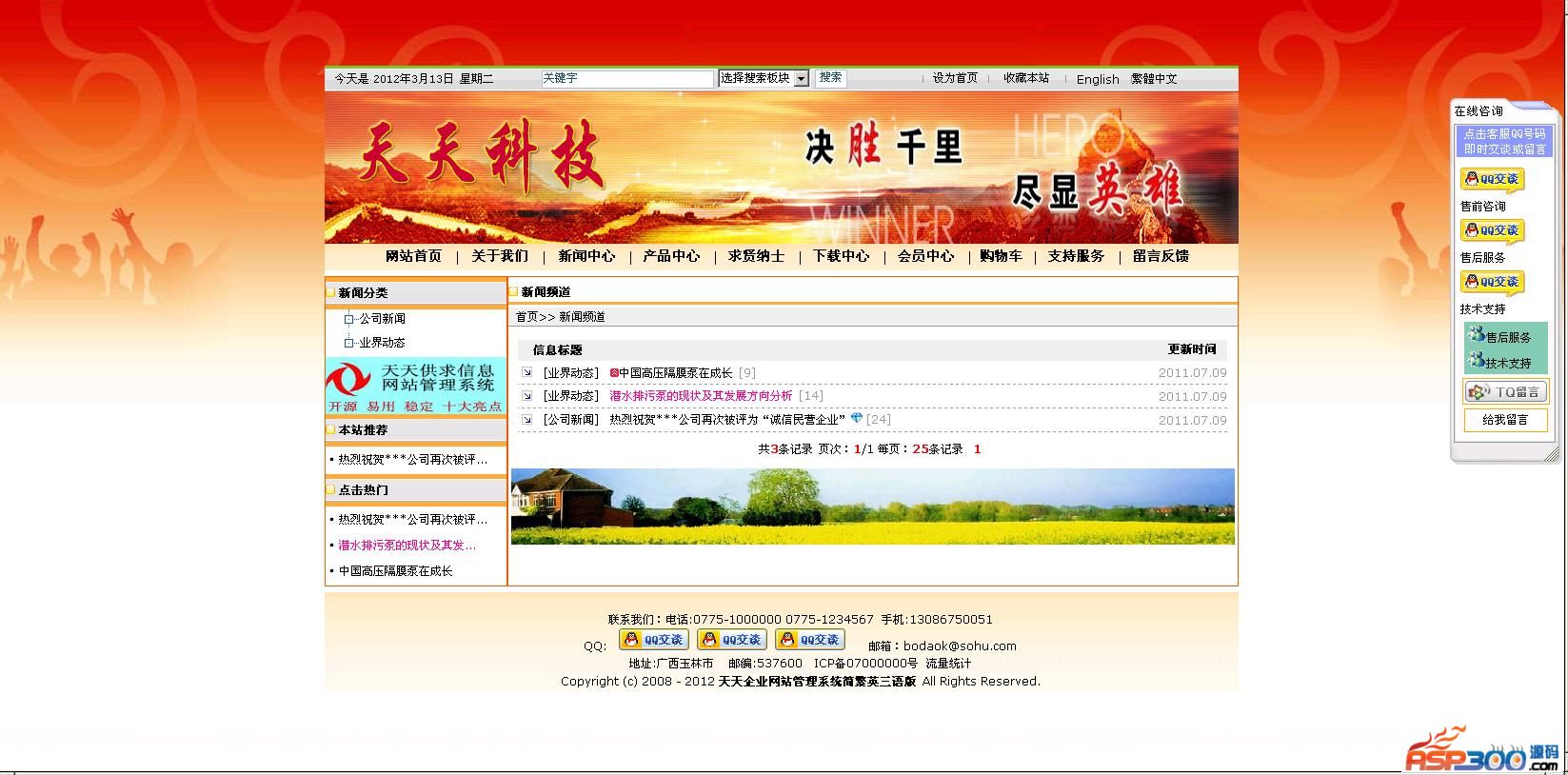 天天企业网站管理系统简繁英三语版(TianTian CMS)是由天天网络科技工作室开发的多语言企业网站源码,主要功能模块有企业信息、新闻动态、产品展示、资源下载、视频中心、人才招聘、支持服务、会员中心、留言反馈等。会员可用QQ快速登录。可在线订购产品和实时支付。
