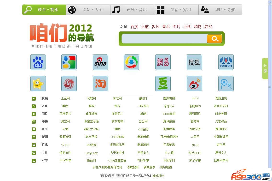 咱们的网址导航站1、可自由修改发布2、不可发布用于非法网站3、后台:/admin/ 帐号和密码:admin4、数据库链接文件:/conn.asp、/admin/conn.asp、/s/db.asp 、/alexa/conn.asp5、后台请使用IE浏览器兼容模式浏览,否则可能导致左侧不可用,就这一问题我们将继续改进6、网站模板可根据需要进行自由修改7、源码中页面最下方有站长统计代码,可将其修改8、部分功能和界面,我们将进一步修正