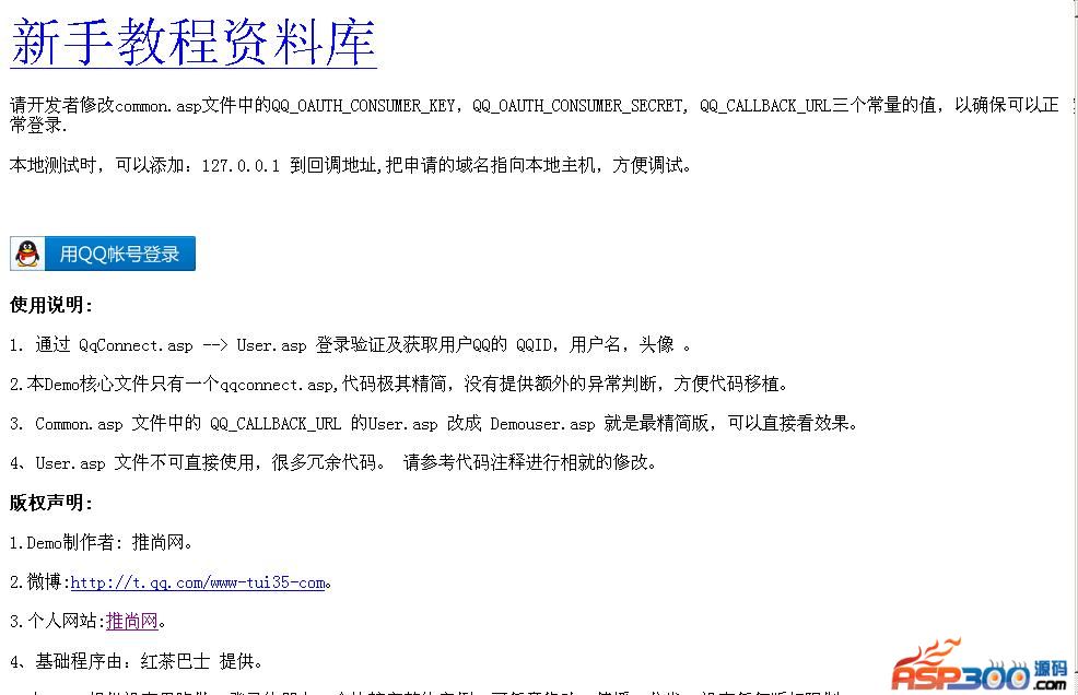 请开发者修改common.asp文件中的QQ_OAUTH_CONSUMER_KEY,QQ_OAUTH_CONSUMER_SECRET, QQ_CALLBACK_URL三个常量的值,以确保可以正常登录.