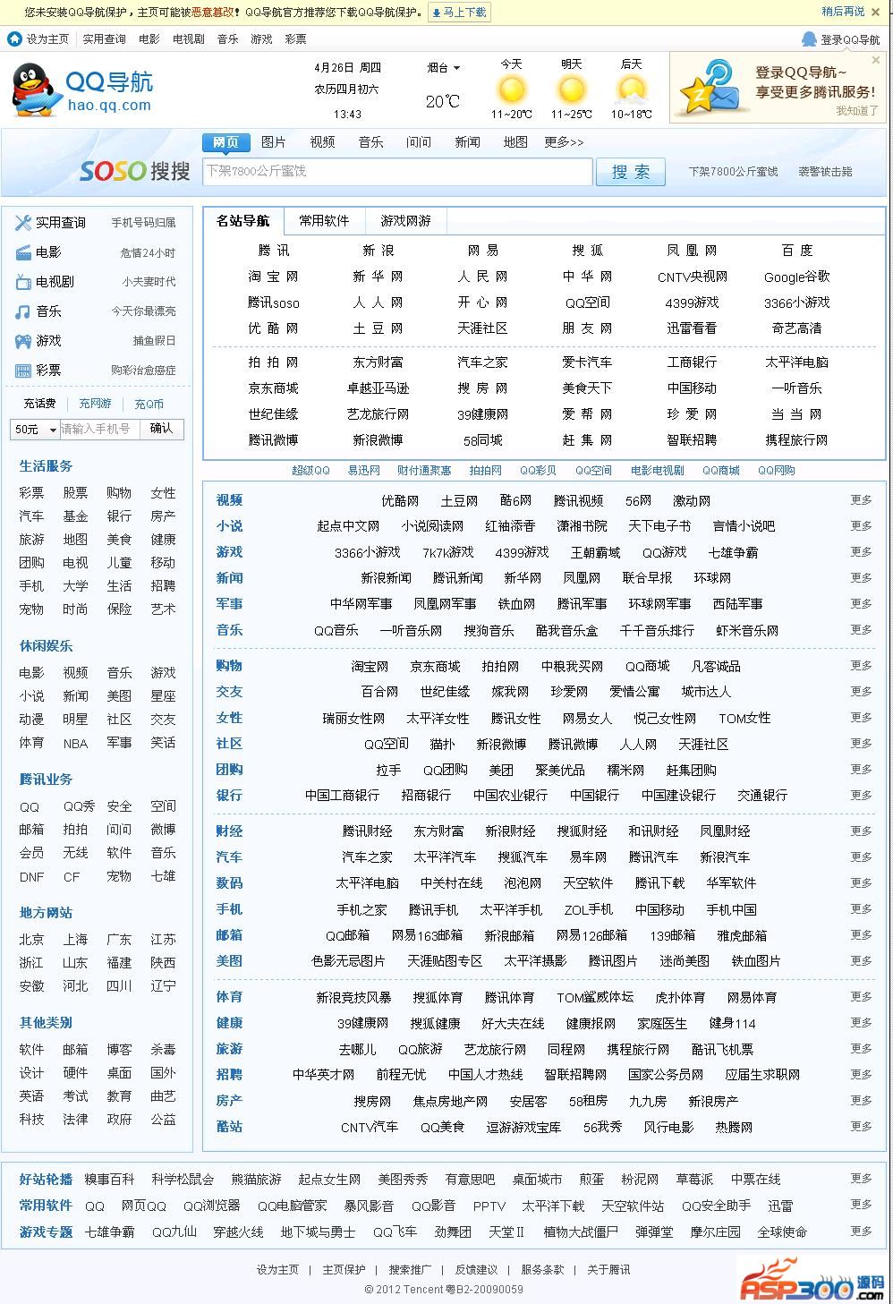前段时间有网友要求做一个QQ导航的源码,本人利用业余时间,历时大半个月今天终于“面市”了,本版完美无错,纯净,精仿,界面绝对完美,完全免费。上传即可使用,轻松建站,访问速度快!支持自动获取北京时间、日期、农历,支持自动获取所在地城市天气预报,支持常用邮箱登陆。QQ导航特色:简单易用,版面整洁,整整有条。关于QQ导航:QQ导航始建于2009年,前身是QQ网址大全,域名是abc.qq.com,后改为hao.qq.com,几次改版都频有特色,每次改版都让人耳目一新,这是腾讯最新打造的导航网站,目的就是为大家提供优秀的互联网入口网站,同时也提供了实用查询、邮箱快速登陆、天气预报等服务。我们的目标是通过QQ导航使您上网更轻松、生活更便捷。2012-12-30 修正部分失效网址。上传即可使用。※ 2012,新版美丽大方、简洁、商务大气!※ 自动定位当前城市天气预报;※ 将hao.qq.com域名替换成你的域名,※ 将[QQ导航][QQ网址大全]名称替换成你的网站名称。※ 统计代码在script/tj.js修改;※ 留言板管理后台http://你的网站/book/admin_index.asp 用户名:admin 密码:admin※ 希望您使用愉快。