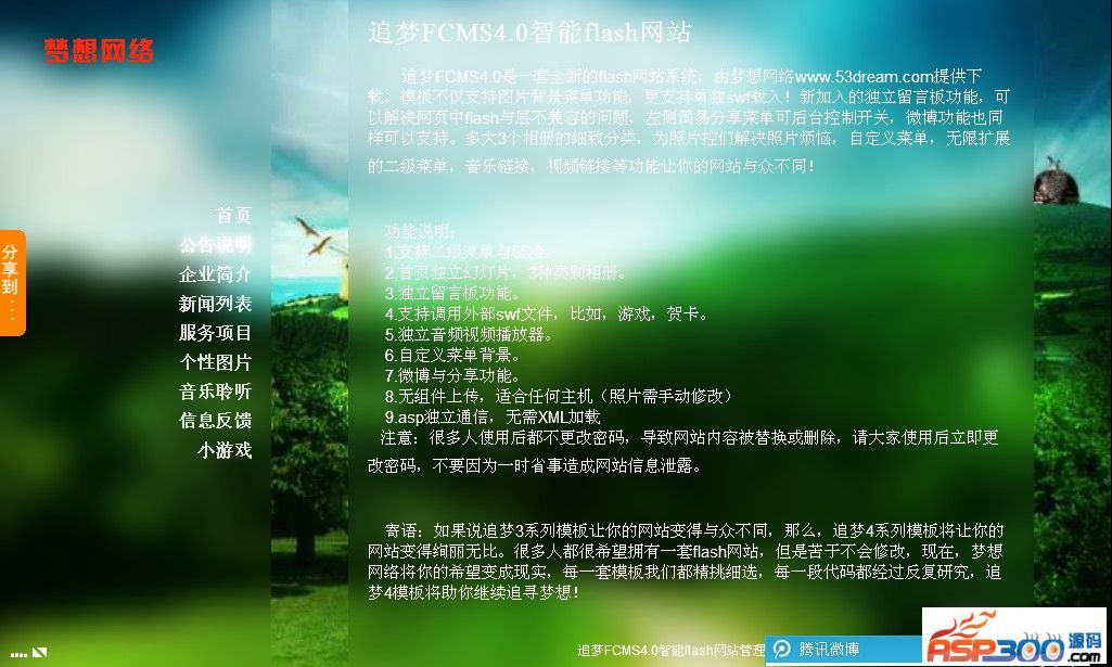 追梦FCMS4.1是一款精美的flash整站系统,你可以通过ASP后台轻松实现网站内容的添加和删除,可以播放歌曲甚至视频。4.1是4.0的升级版,增加了视频功能,压缩了部分flash代码,整合了部分ASP文件,在运行方面,4.1效果更加流畅,图片增加了滤镜清晰效果,显示更接近原图,在文字处理方面,追梦4.1也提高了清晰度,避免了繁体字出现模糊情况。