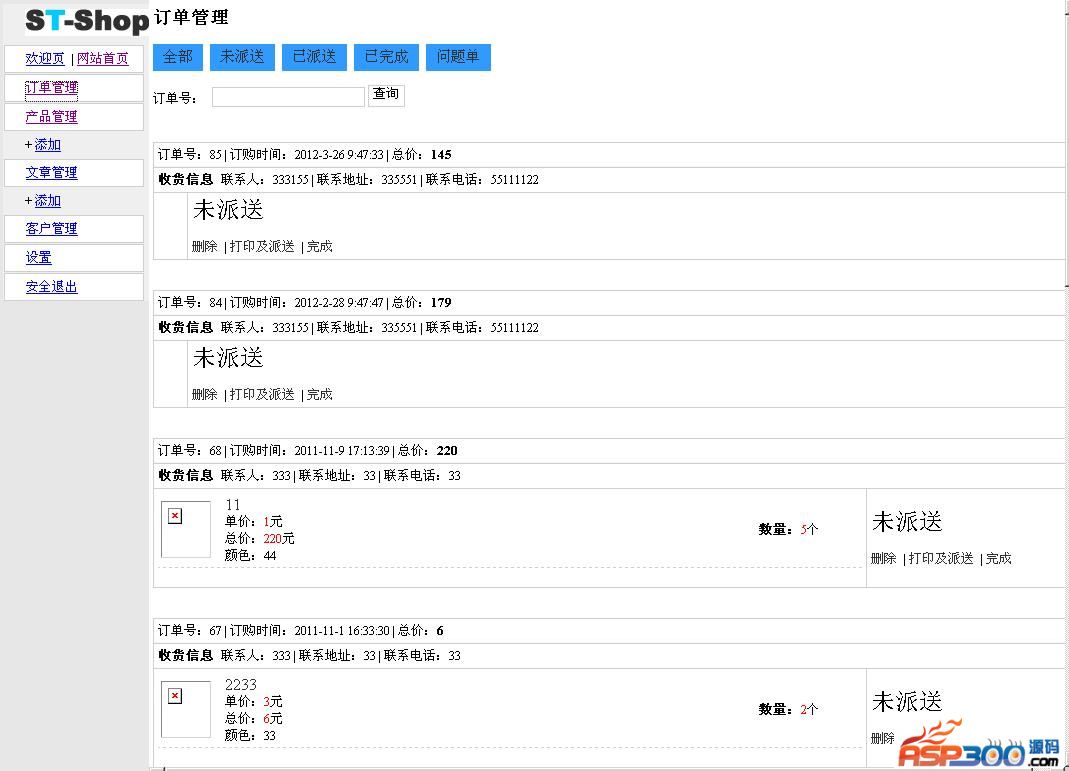 st-shop是一个简单的,易于修改的、免费的网络商城系统。商城系统st-shop功能简述:1.最多支持3级商品分类2.支持图片上传3.会员管理4.购物车系统商城系统st-shop v1.4更新:1.简化的后台管理,功能更清晰;2.强化订单管理,增加打印,订单预览、订单分类等功能;3.产品管理增加条形码管理,优化产品增加及修改界面,优化列表功能,列表集成多项功能按钮;4.优化整合设置模块,加入密码管理,商店信息管理,搜索结果管理;5.商品信息管理增加多项参数,与短信平台整合;6.增加模版选择选项;7.优化前台界面;8.优化购物车;9.增加分享返现模块;10.增加收货地址管理;管理员登录地址:adminlogin.asp初始用户名及密码:admin/888888