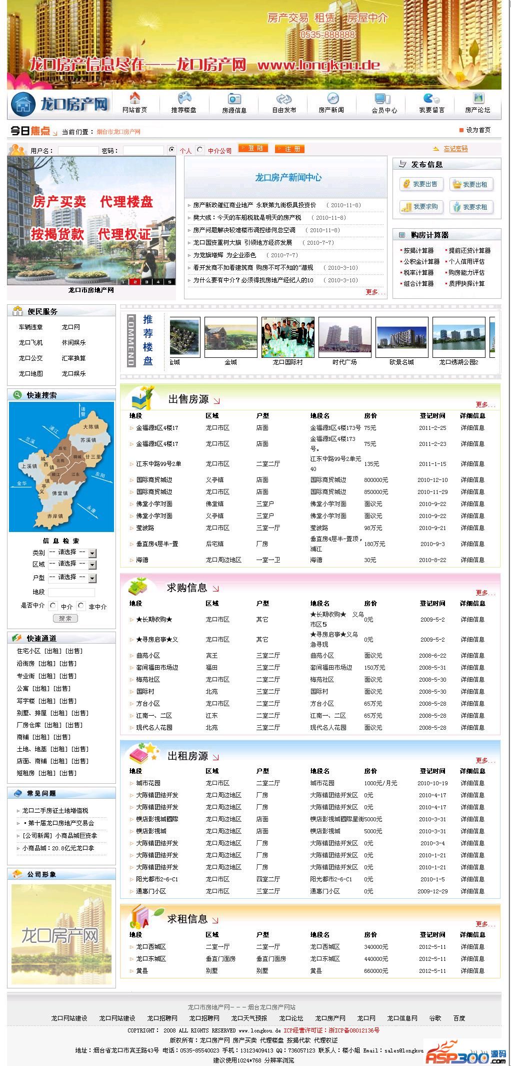 龙口房产网整站是网站未改版之前使用的一套系统,因更换新系统特此放出,此系统大气简洁,是很不错的房地产网站源码,数据库未删除数据,包含龙口房产网所有房产数据,安装之后和演示一模一样,可直接使用,本系统无任何功能限制。